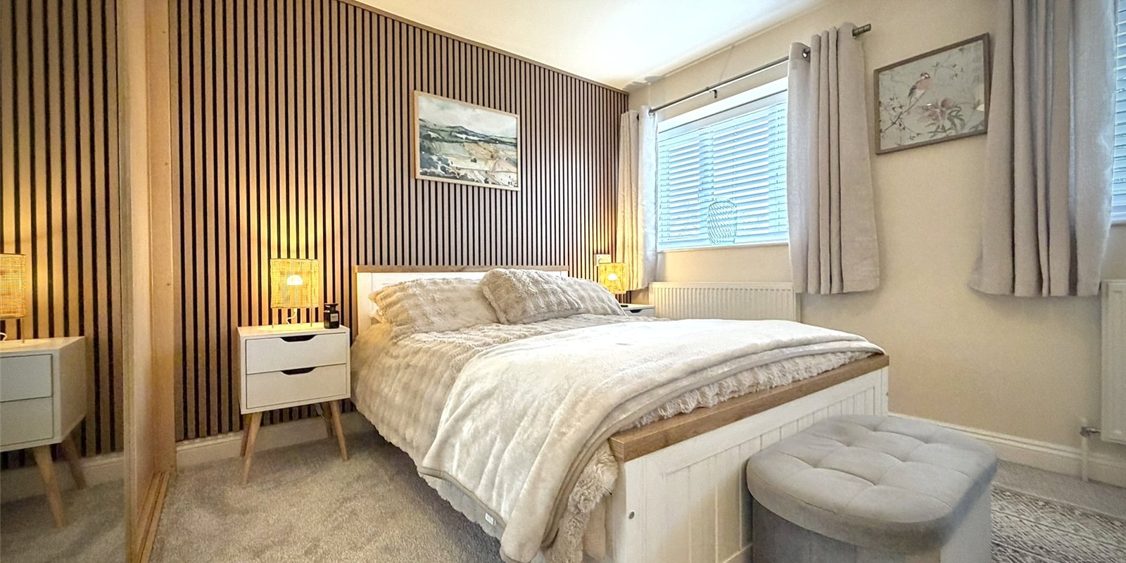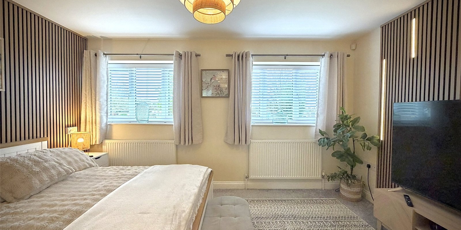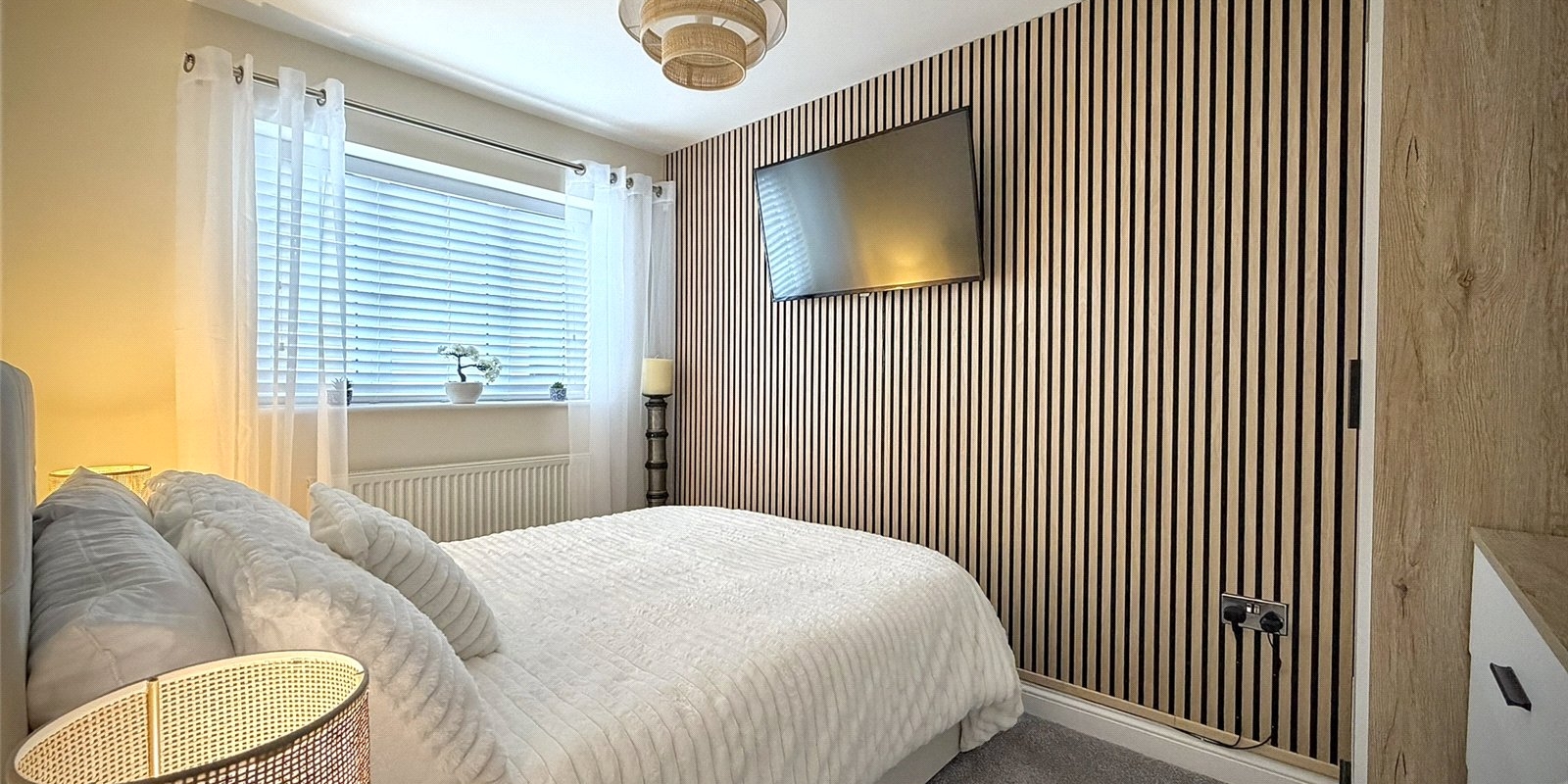 Upstairs, the spacious landing provides access to three well-proportioned bedrooms. The principal bedroom spans the full width of the property and benefits from dual aspect windows overlooking the garden, bespoke fitted wardrobes, and feature acoustic panelling. The second bedroom is a generous double with feature wall, while the third is a well-sized single. A modern family bathroom completes the first floor.