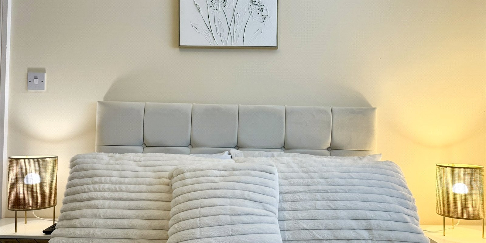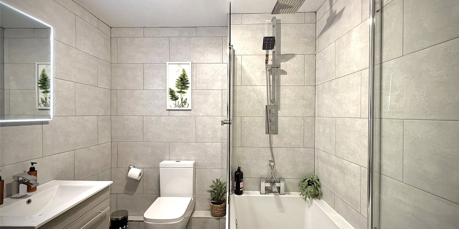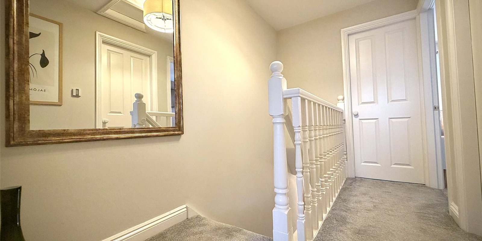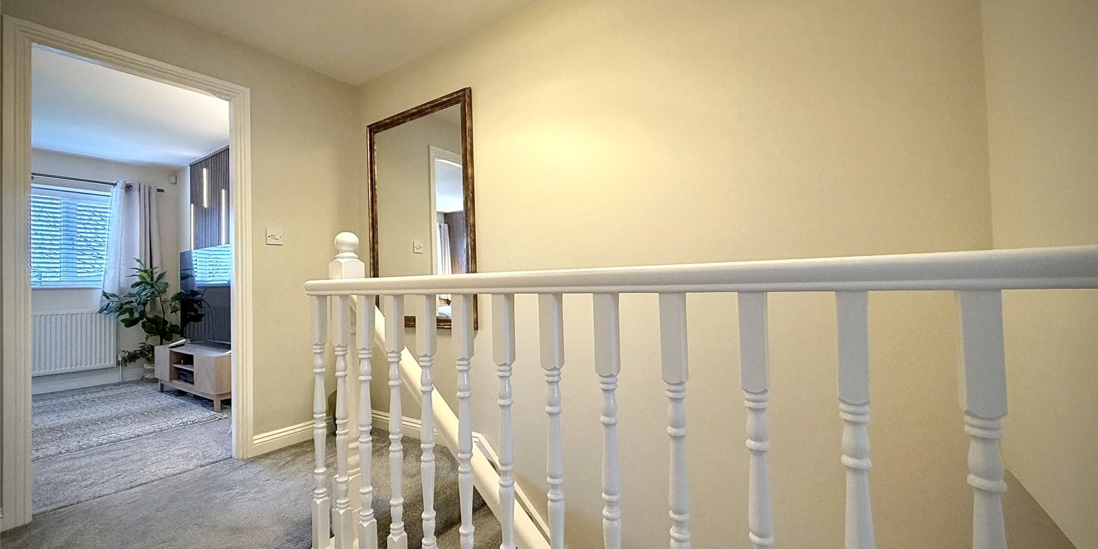 Upstairs, the spacious landing provides access to three well-proportioned bedrooms. The principal bedroom spans the full width of the property and benefits from dual aspect windows overlooking the garden, bespoke fitted wardrobes, and feature acoustic panelling. The second bedroom is a generous double with feature wall, while the third is a well-sized single. A modern family bathroom completes the first floor.