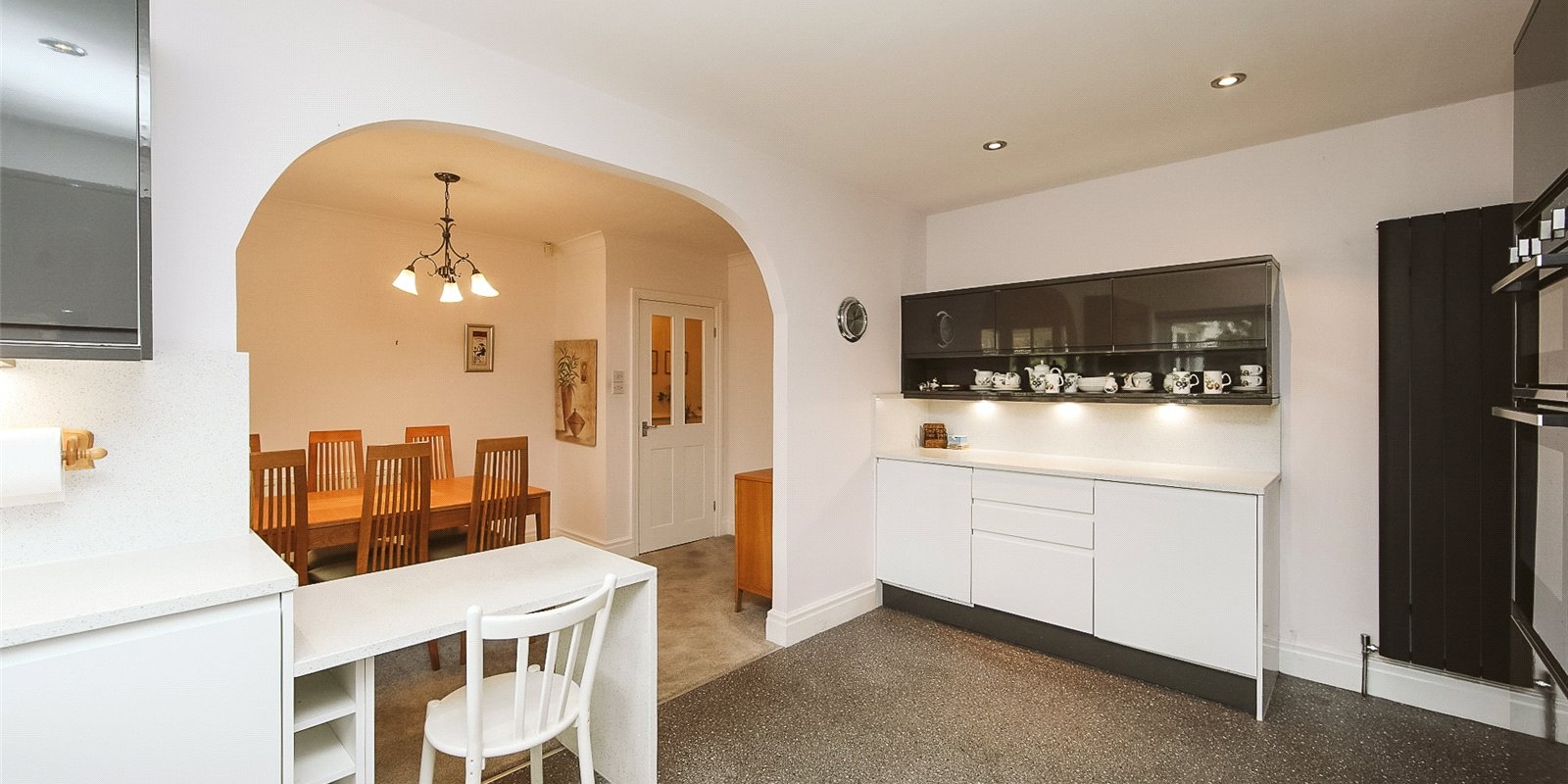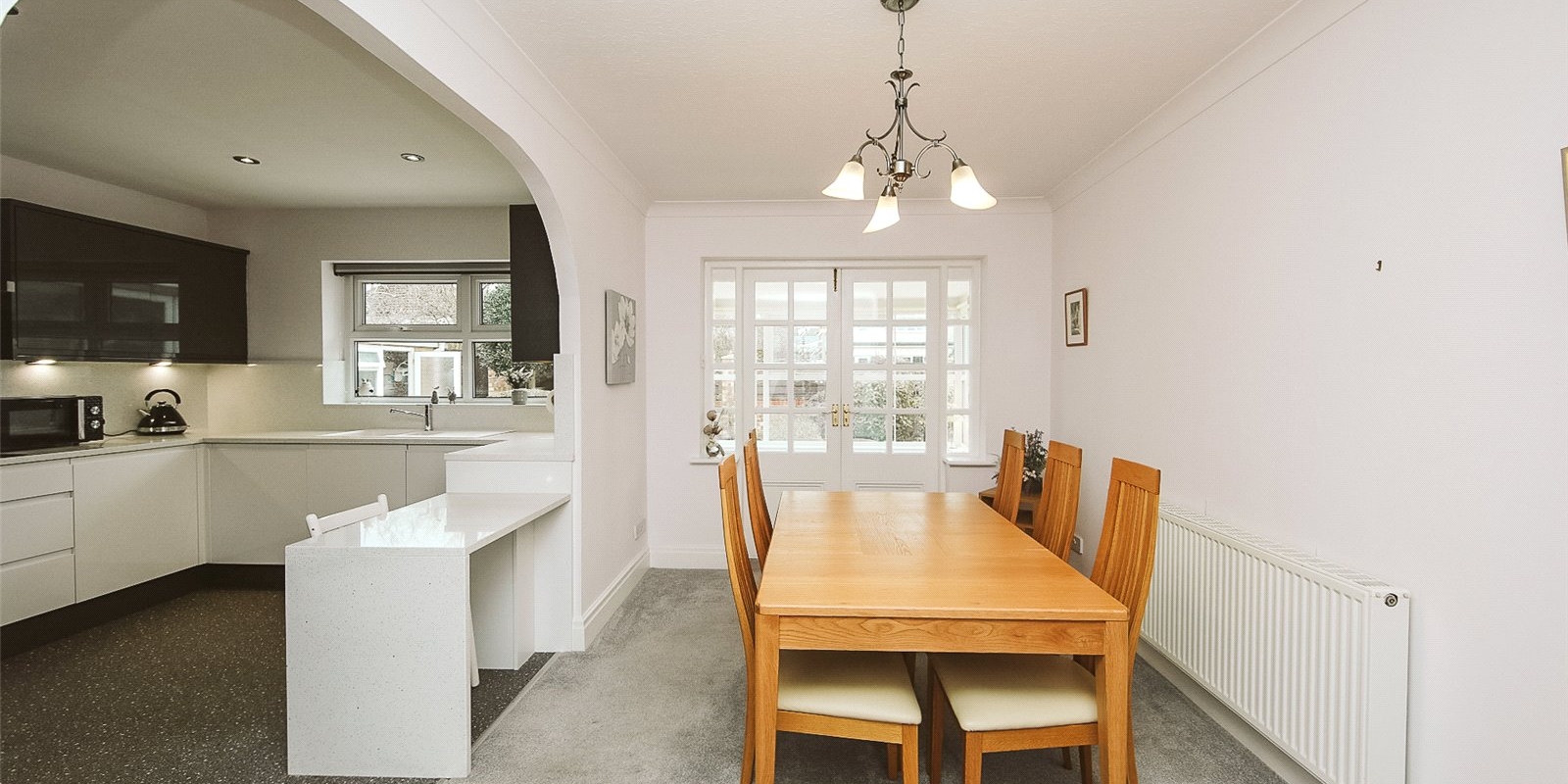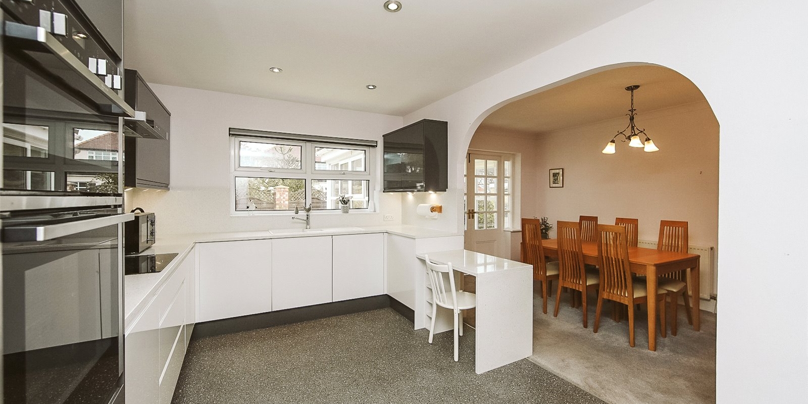 The open-plan kitchen and dining area form the heart of the home, immaculately presented with ample worktop and unit space, ideal for modern family living or entertaining. The space flows beautifully via sliding doors into a sun-catching conservatory offering an abundance of natural light and lovely views over the rear garden.