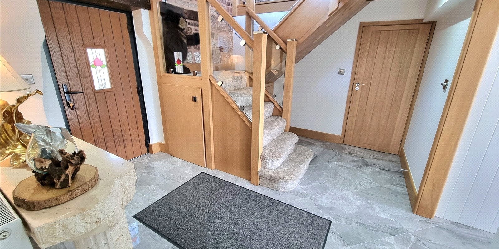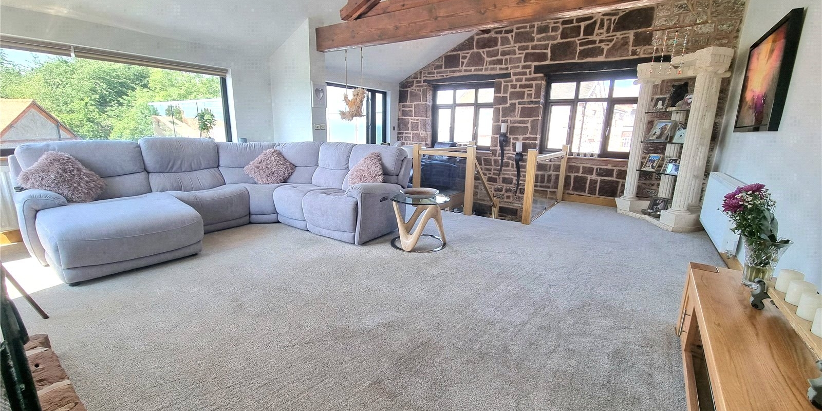 On the first floor, the large vaulted ceiling living room with exposed beams and open real fireplace provides the perfect place to relax and unwind, looking at the ever changing views across the estuary and hills through the panoramic windows; double doors lead out to the roof terrace, ideal for breakfast, lunch, dinner or just drinks watching the sun set.