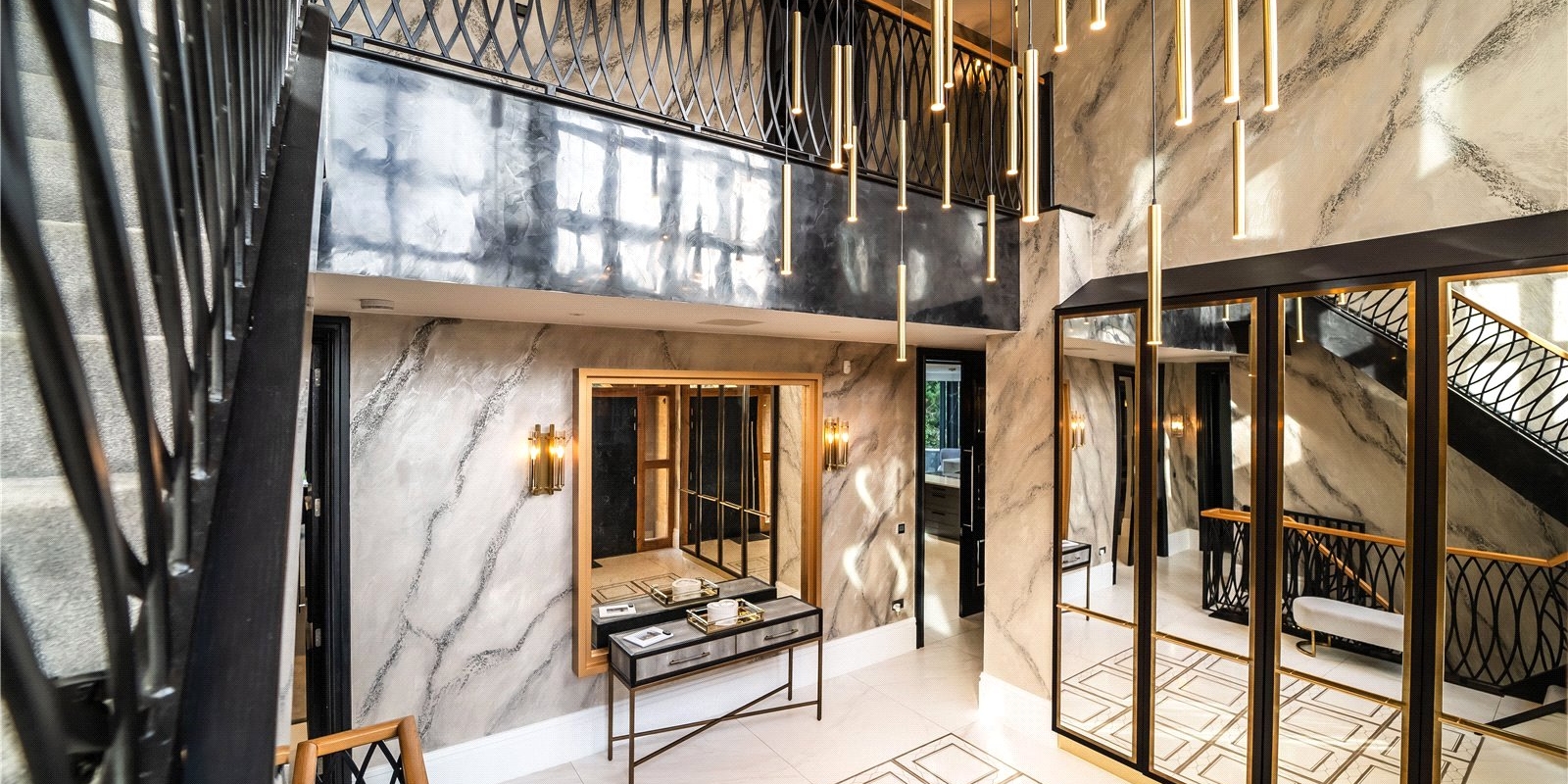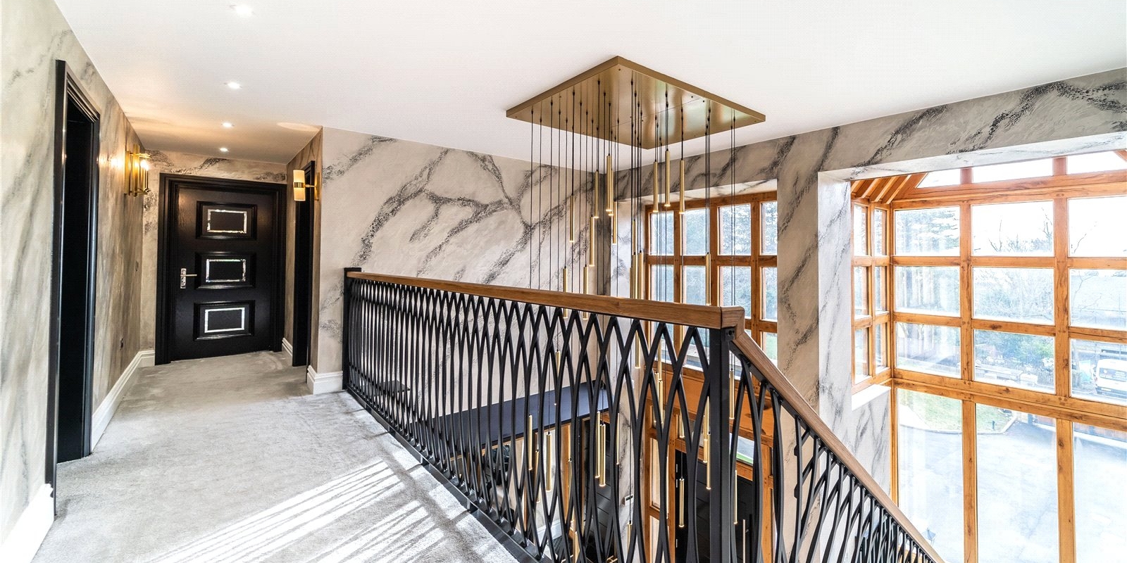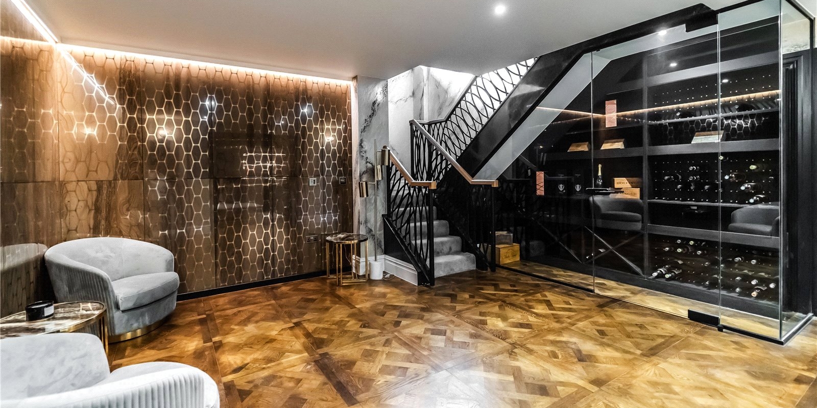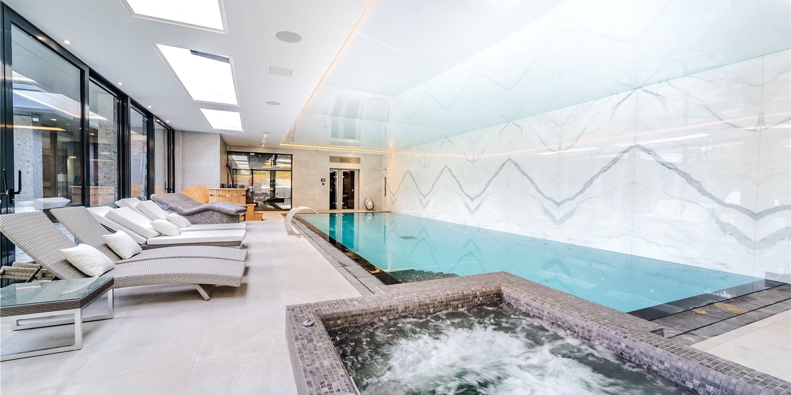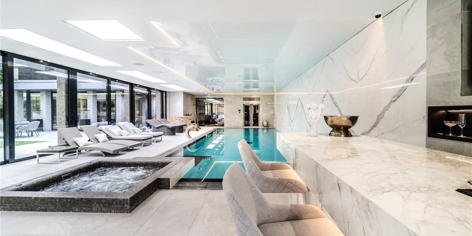 Internally, one is drawn to the bold material palette and inspried entrance. In summary, the ground floor features a grand entrance hallway, formal lounge, study, playroom, utility room, and W.C. The breathtaking and luxurious open-plan family living kitchen diner boasts a wealth of superior fixtures and fittings. Additionally, the ground floor provides access to a stunning leisure suite, including a spacious gym, swimming pool with bar area, sauna, steam room, and shower room.
