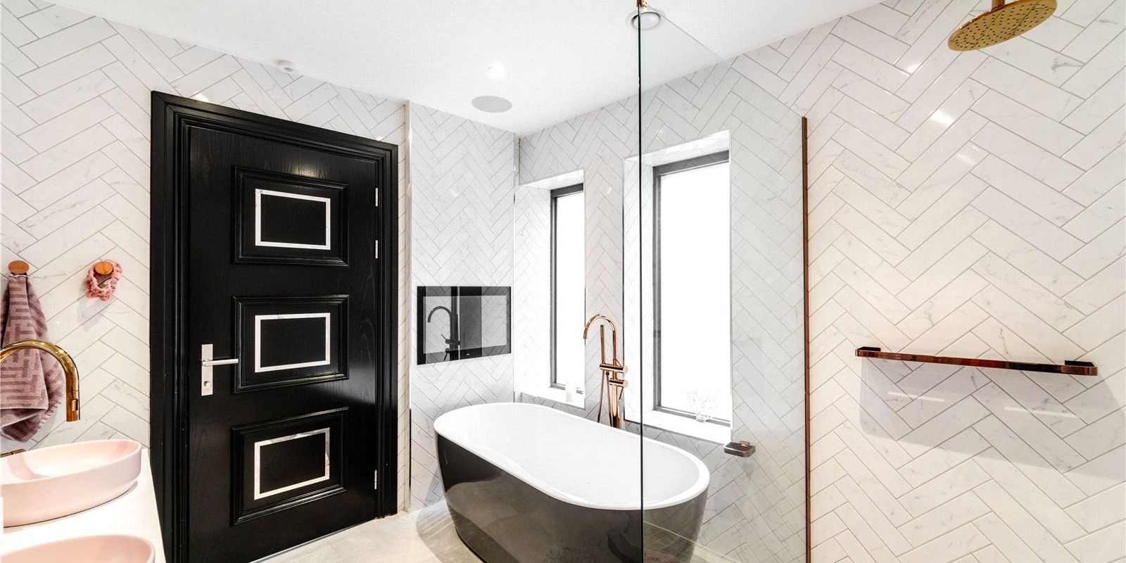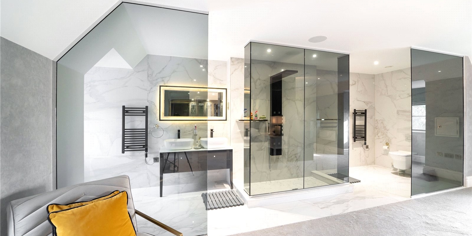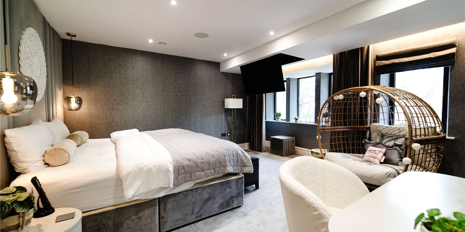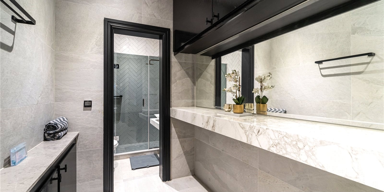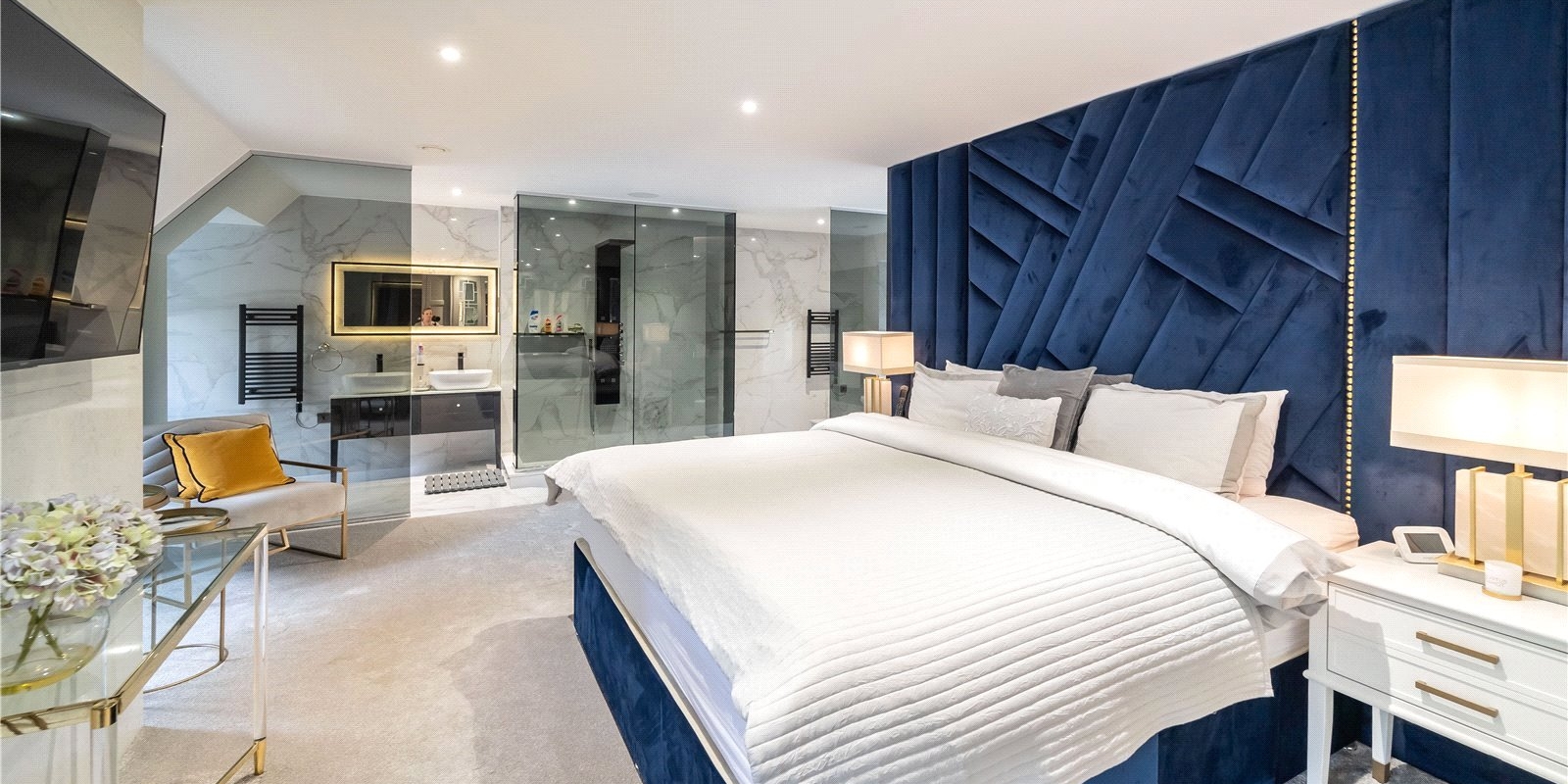Internally, one is drawn to the bold material palette and inspried entrance. In summary, the ground floor features a grand entrance hallway, formal lounge, study, playroom, utility room, and W.C. The breathtaking and luxurious open-plan family living kitchen diner boasts a wealth of superior fixtures and fittings. Additionally, the ground floor provides access to a stunning leisure suite, including a spacious gym, swimming pool with bar area, sauna, steam room, and shower room.