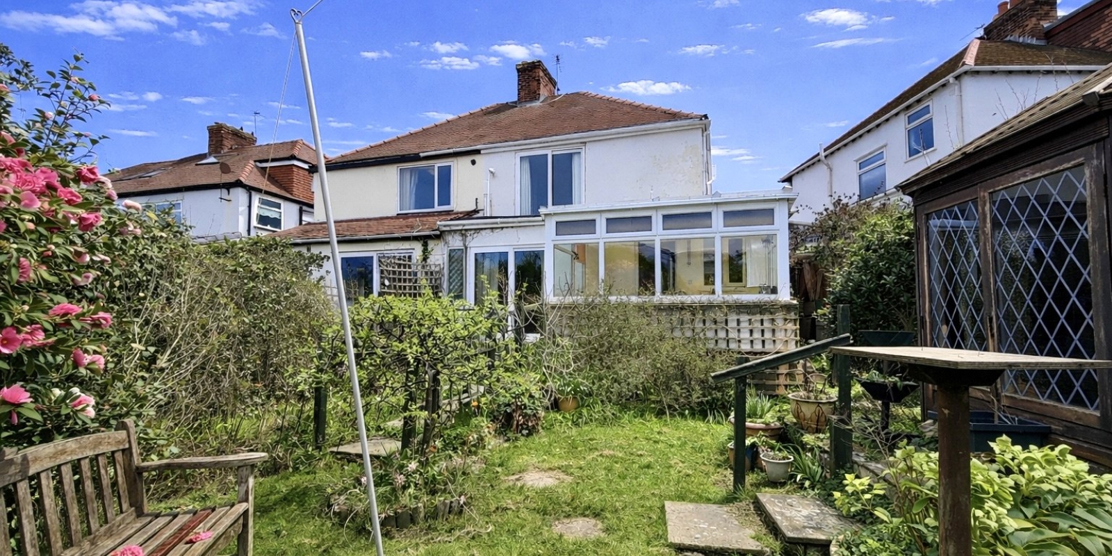 Outside, to the front of the property there is off street parking and a gate giving access to the side of the property through to the charming rear garden. The garden provides a quiet, pleasant and private setting with plenty of room for relaxing, gardening, or family time. Currently there is a summer house and the garden comfortably houses two sheds.