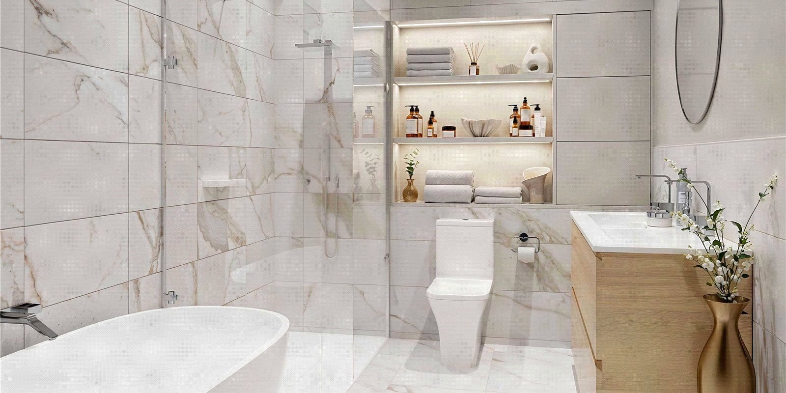 Vanity units provide discreet yet ample storage, while deep, inviting baths offer the perfect place to unwind.