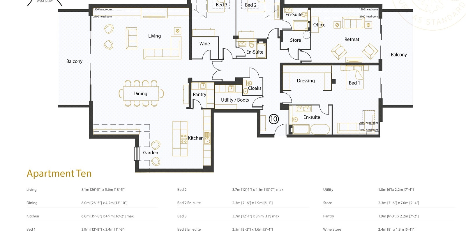 Apartment 10 is a beautifully crafted penthouse home, with underfloor heating throughout, comprising of three bedrooms, three en-suite bathrooms, utility/bootroom, separate cloaks/w.c. kitchen, dining, living room with valuted ceilings, retreat/home office, and two private balconies. One overlooks the beautiful landscaped garden and the Royal Liverpool Golf Course and further reaching views of Hilbre Island and the wirral coastline. The other, can be accessed from both the master bedroom and the retreat/home office space. Within easy reach of West Kirby town centre, enjoy a perfect blend of coastal calm, architectural elegance, and modern convenience. The convenience of the lift access only accentuates the premium elements of this development.