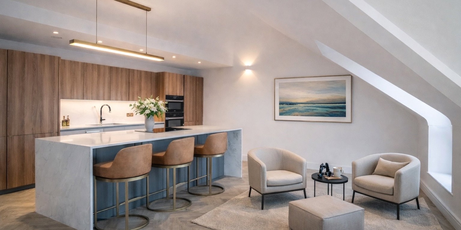 Generously proportioned and bathed in natural light, these serene spaces offer a sense of calm and comfort, with select rooms benefiting from captivating views across the coast and countryside. Walk-in wardrobe areas provide bespoke storage options, while the indulgent en-suites - finished with the finest materials - bring a boutique hotel feel to everyday living. From first light to nightfall, these are rooms that embody quiet luxury. Tucked away from the main living areas, the penthouse retreat offers a serene haven designed for moments of quiet indulgence. Whether you're catching up on a novel, immersing yourself in a film, or simply enjoying the stillness, this elegant space invites you to unwind in complete privacy.