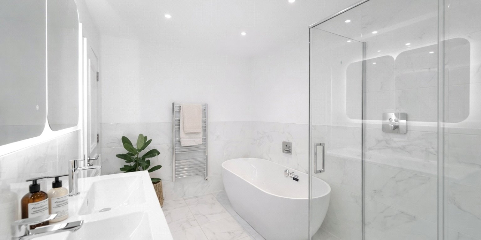 Chrome heated towel radiators complete the experience, ensuring comfort and warmth from the moment you step out of the shower or bath.