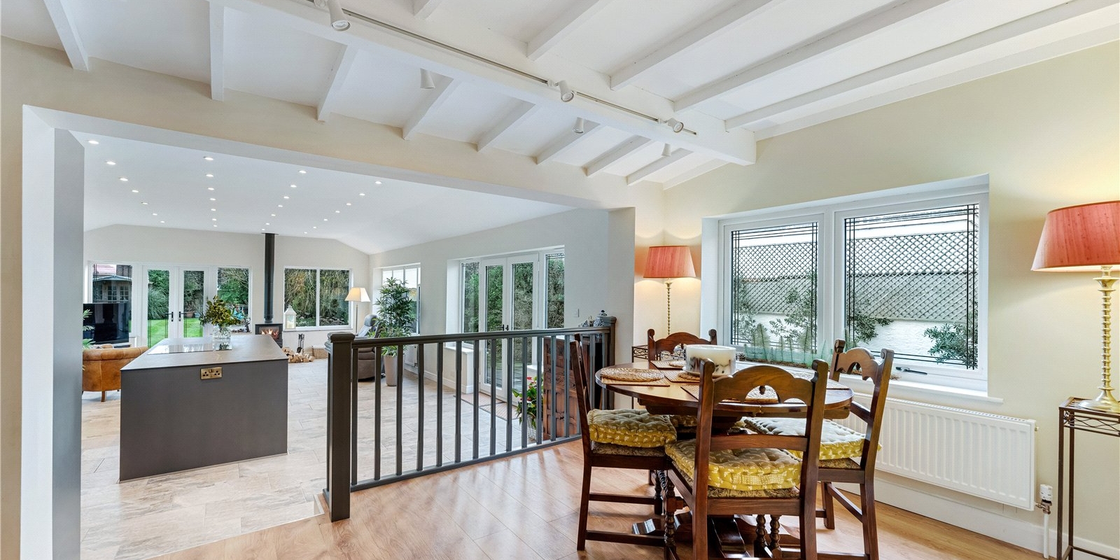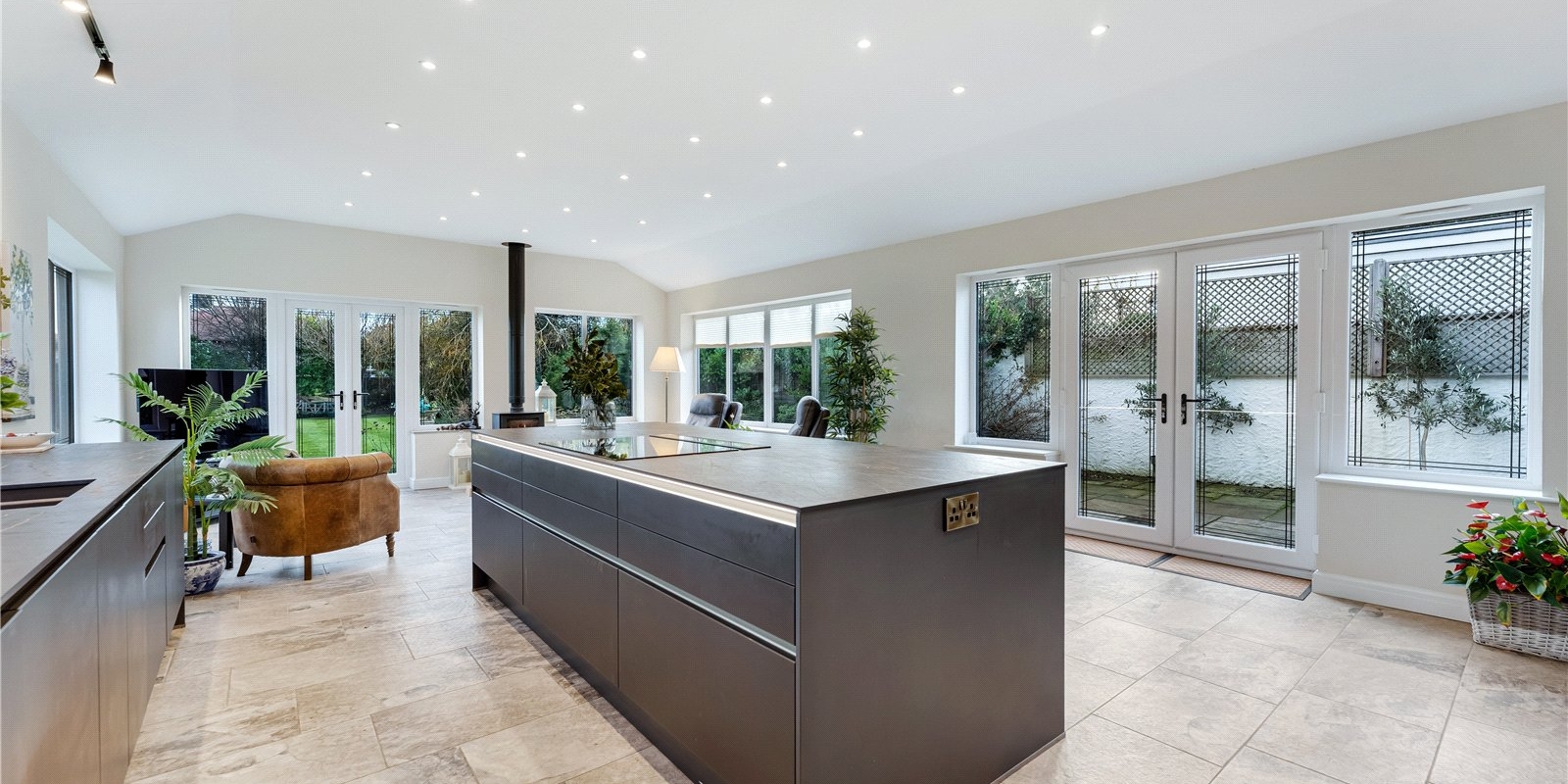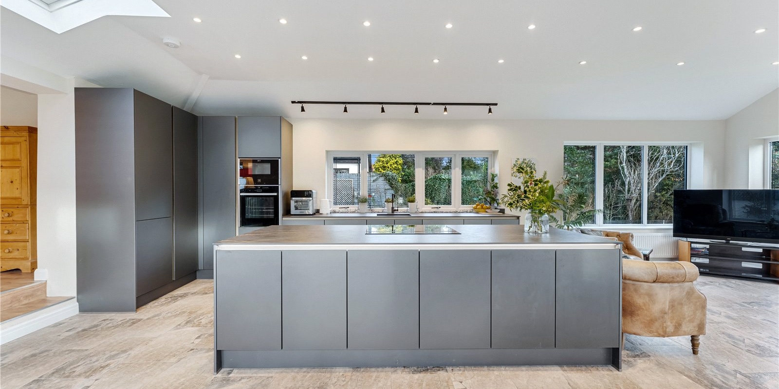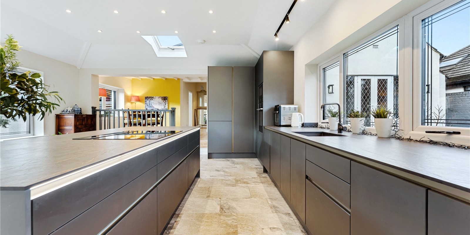 At the heart of the home is the stunning extended kitchen, finished to an exceptional standard with sleek modern cabinetry, premium built-in appliances, and high-quality fittings throughout. The kitchen is tiered, creating a natural separation between cooking and dining areas, with ample space for a dining table. A striking feature is the innovative extractor that rises seamlessly from the worktop, enhancing the clean, modern aesthetic.
