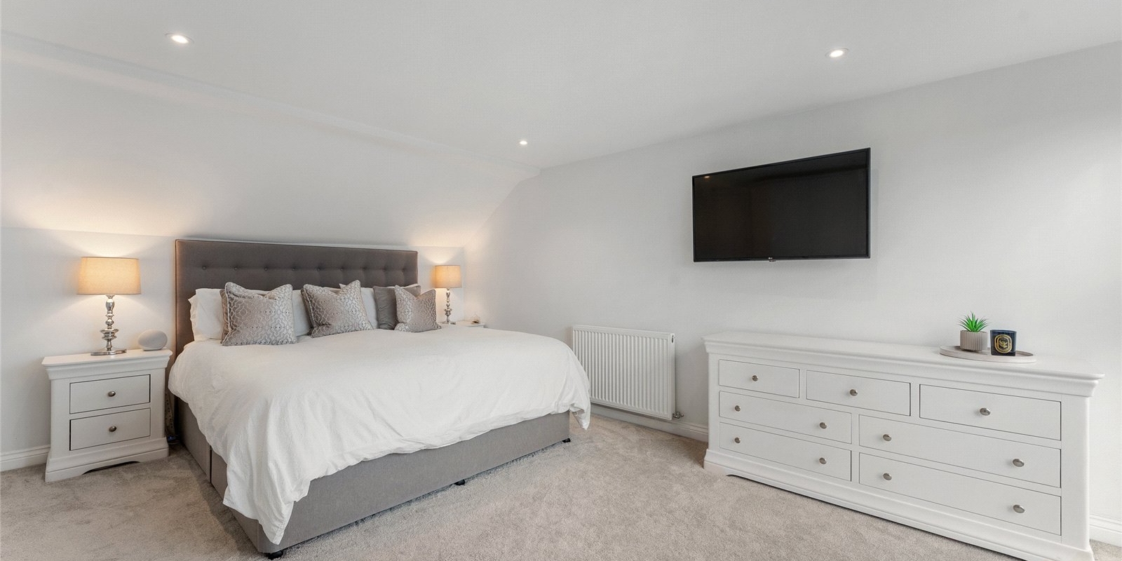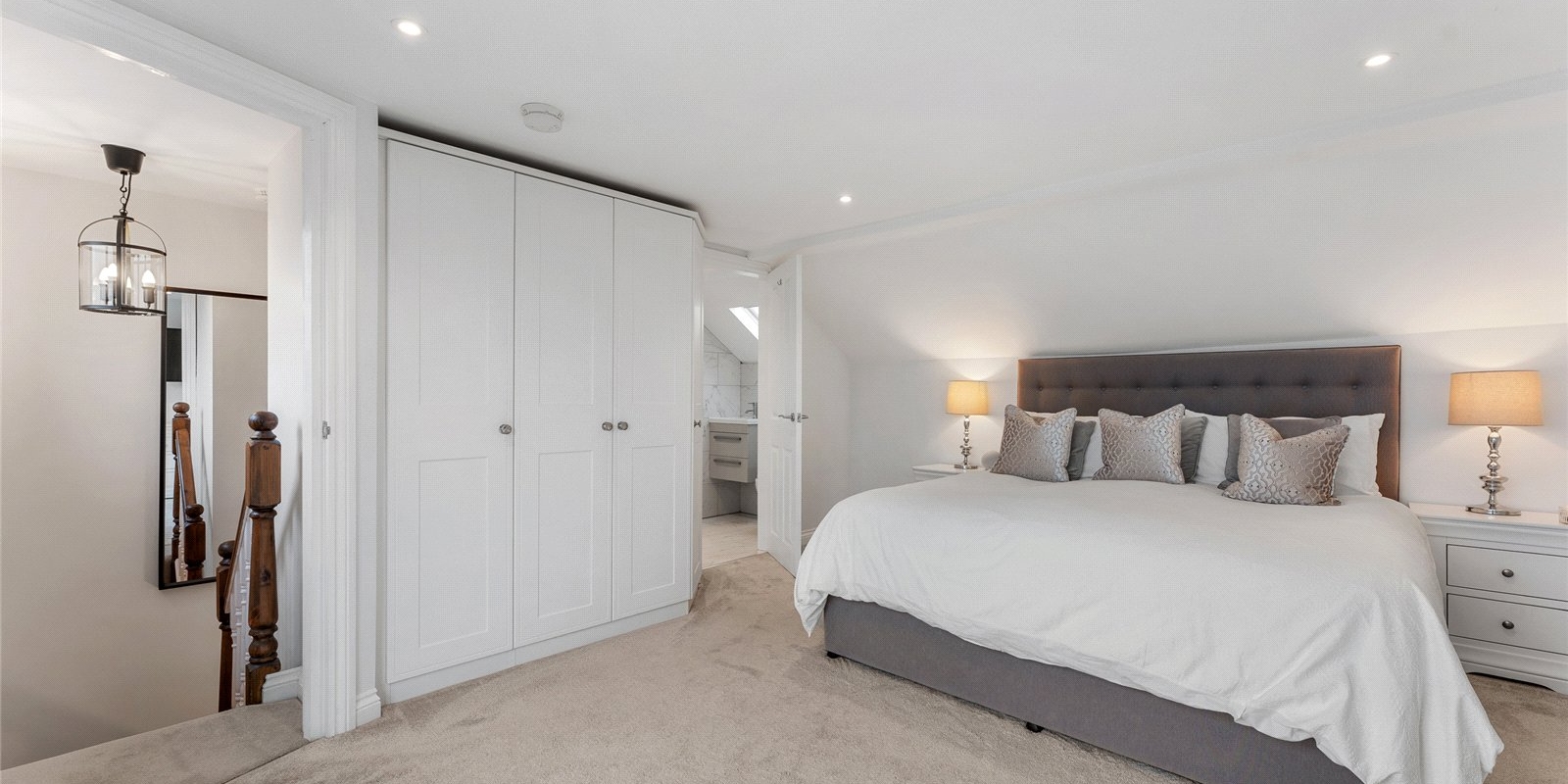The property has been further enhanced by a loft conversion, now forming a spacious fourth bedroom. This impressive room features floor-to-ceiling windows that frame beautiful open views, flooding the space with natural light and creating a peaceful retreat. The bedroom also benefits from its own ensuite, making it ideal as a principal suite or guest bedroom.