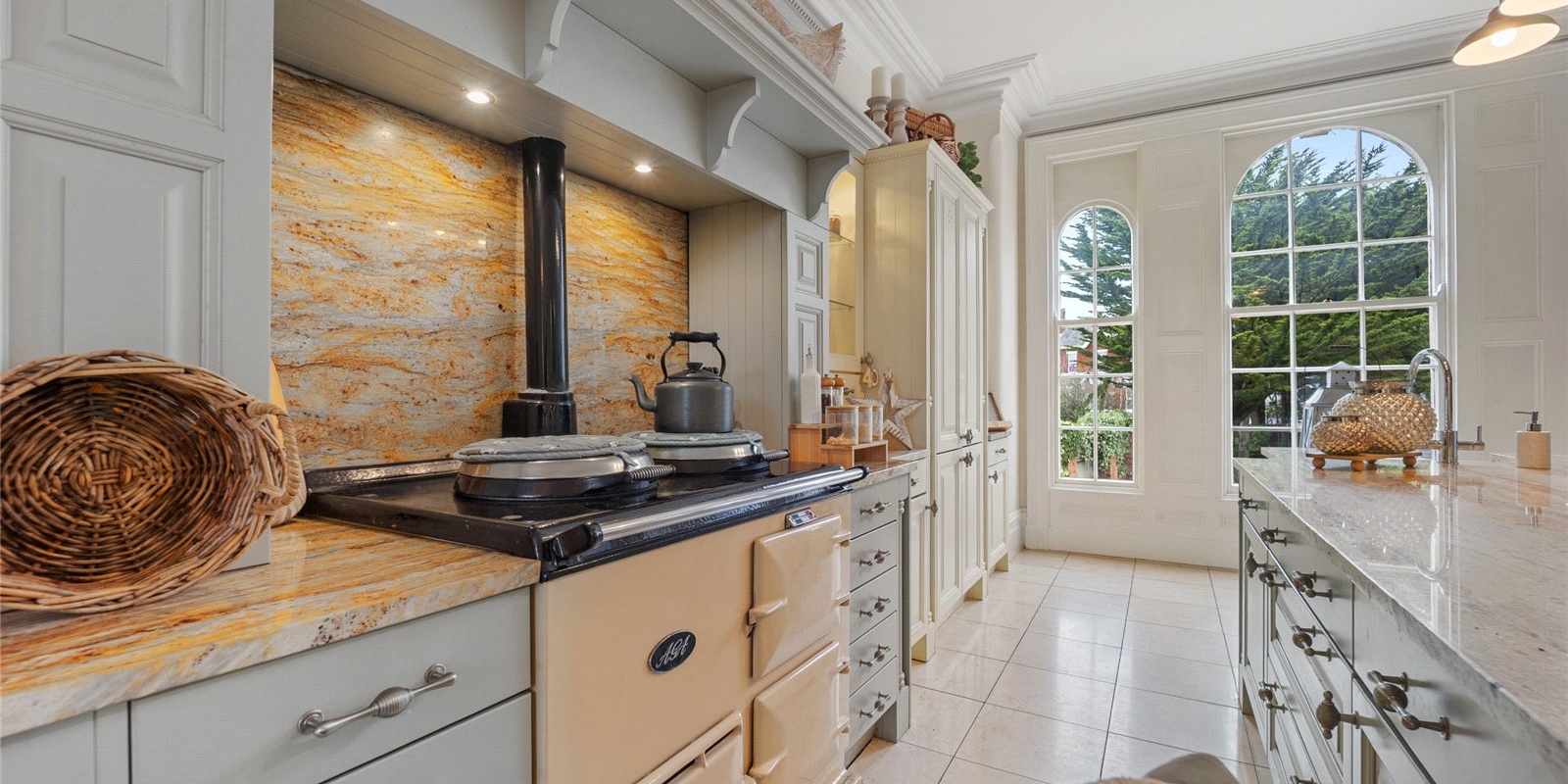 At the heart of the home lies a magnificent bespoke kitchen, designed as both a practical family hub and an elegant entertaining space. The kitchen is beautifully appointed with integrated appliances and a traditional AGA, combining modern functionality with classic character. This inviting and homely space offers generous room for dining and socialising, while adjoining spaces include a separate utility room and study area, ideal for modern lifestyles and working from home.