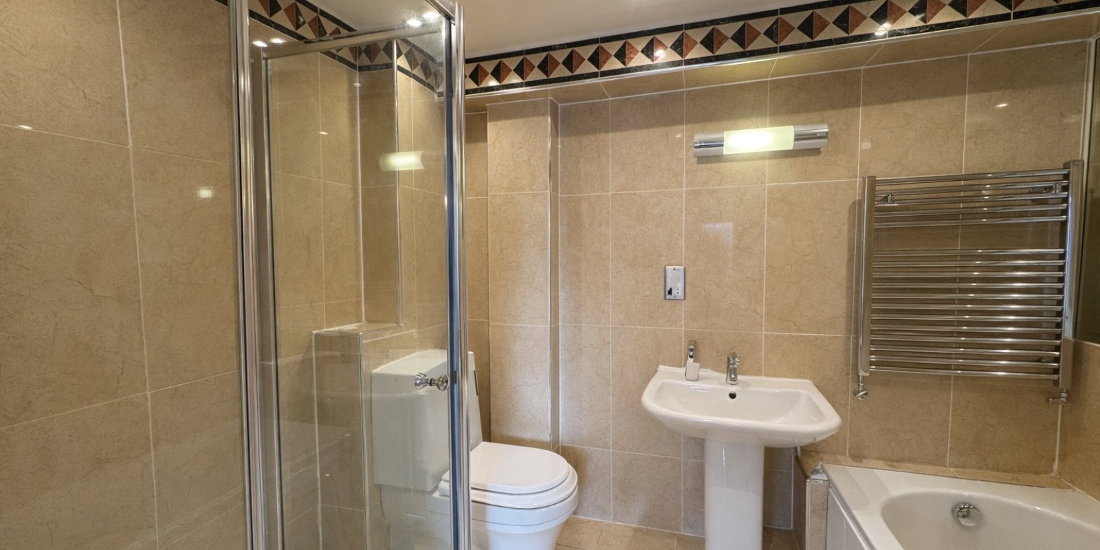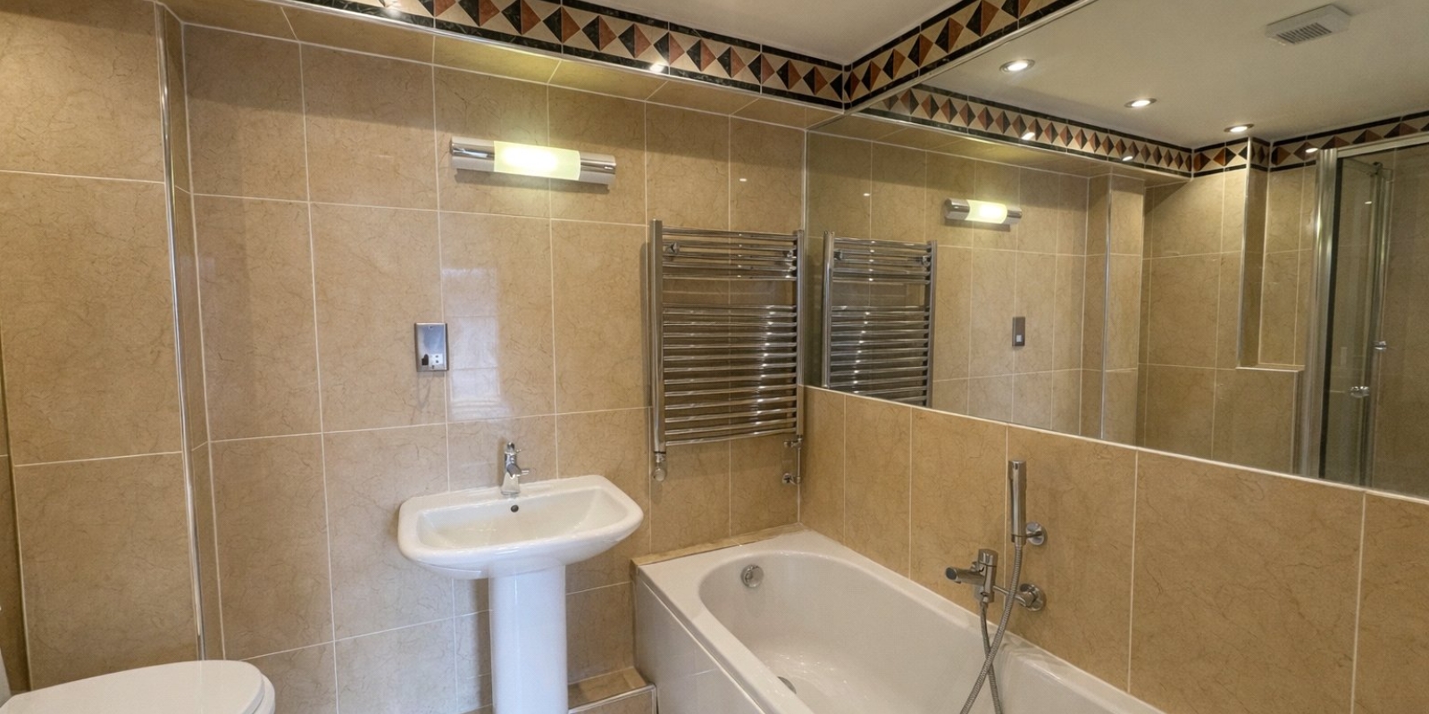 En-Suite - 8' 11" x 6' 1" (2.72m x 1.85m) Modern white suite comprising of WC, pedestal hand wash basin, bath and separate shower. Tiled walls & floor, recessed ceiling with spotlights, heated towel rail and extractor fan.