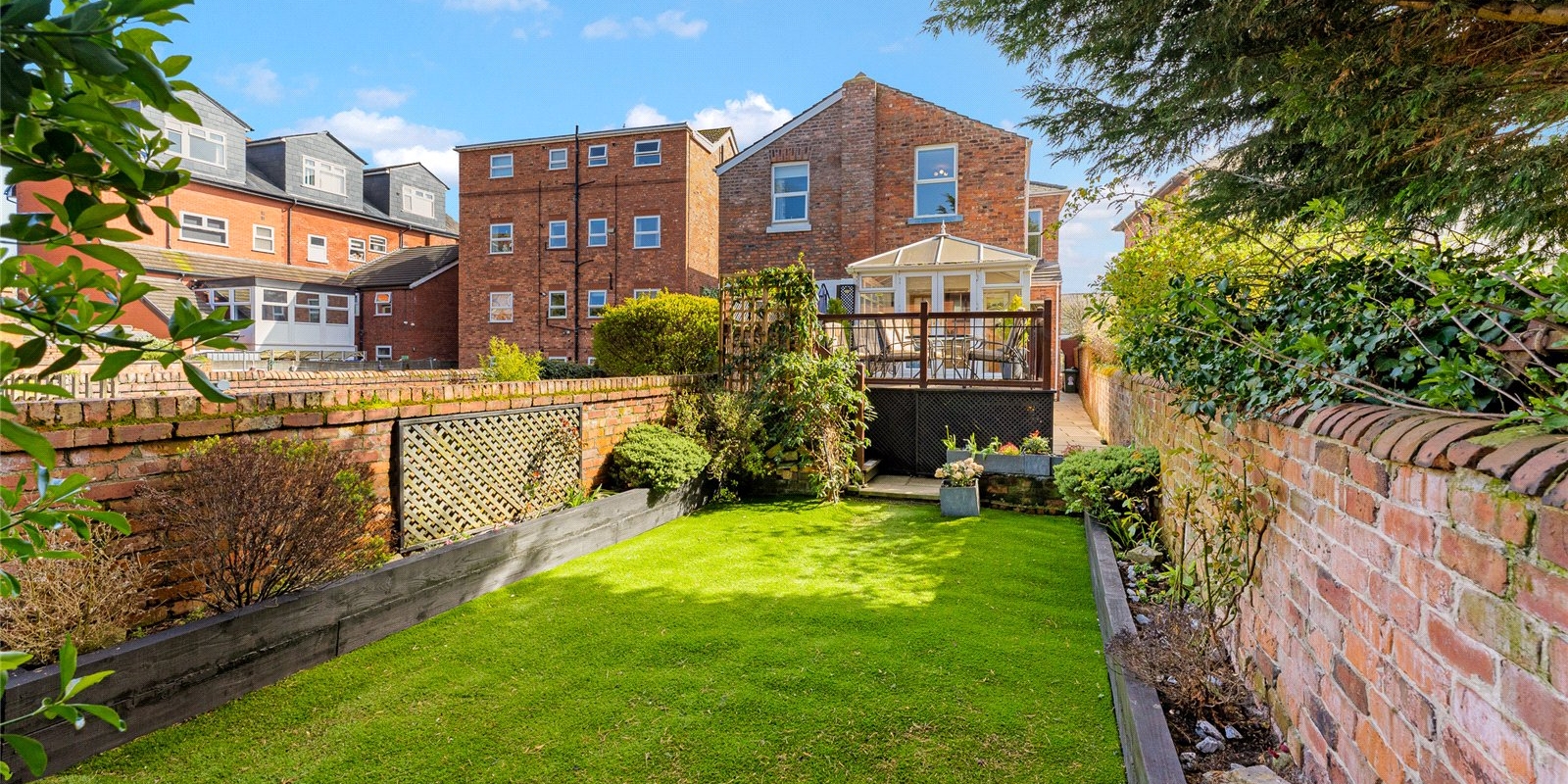 To the rear, a bright and airy conservatory creates an additional reception space, enjoying a sunny aspect and pleasant views over the garden. This leads directly onto a raised terrace—perfect for outdoor dining—while steps descend to a beautifully maintained, private garden, offering a peaceful retreat with a high degree of seclusion. A useful side access adds further practicality.