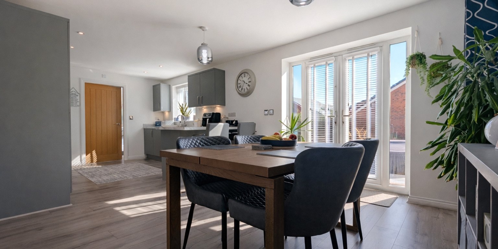 The property opens into a welcoming entrance hallway with useful storage, leading through to a spacious and well-proportioned lounge, providing a bright and comfortable living environment. To the rear, the open-plan kitchen and dining room has been thoughtfully improved with the addition of a modern kitchen island, creating a highly sociable and practical space ideal for both everyday living and entertaining.