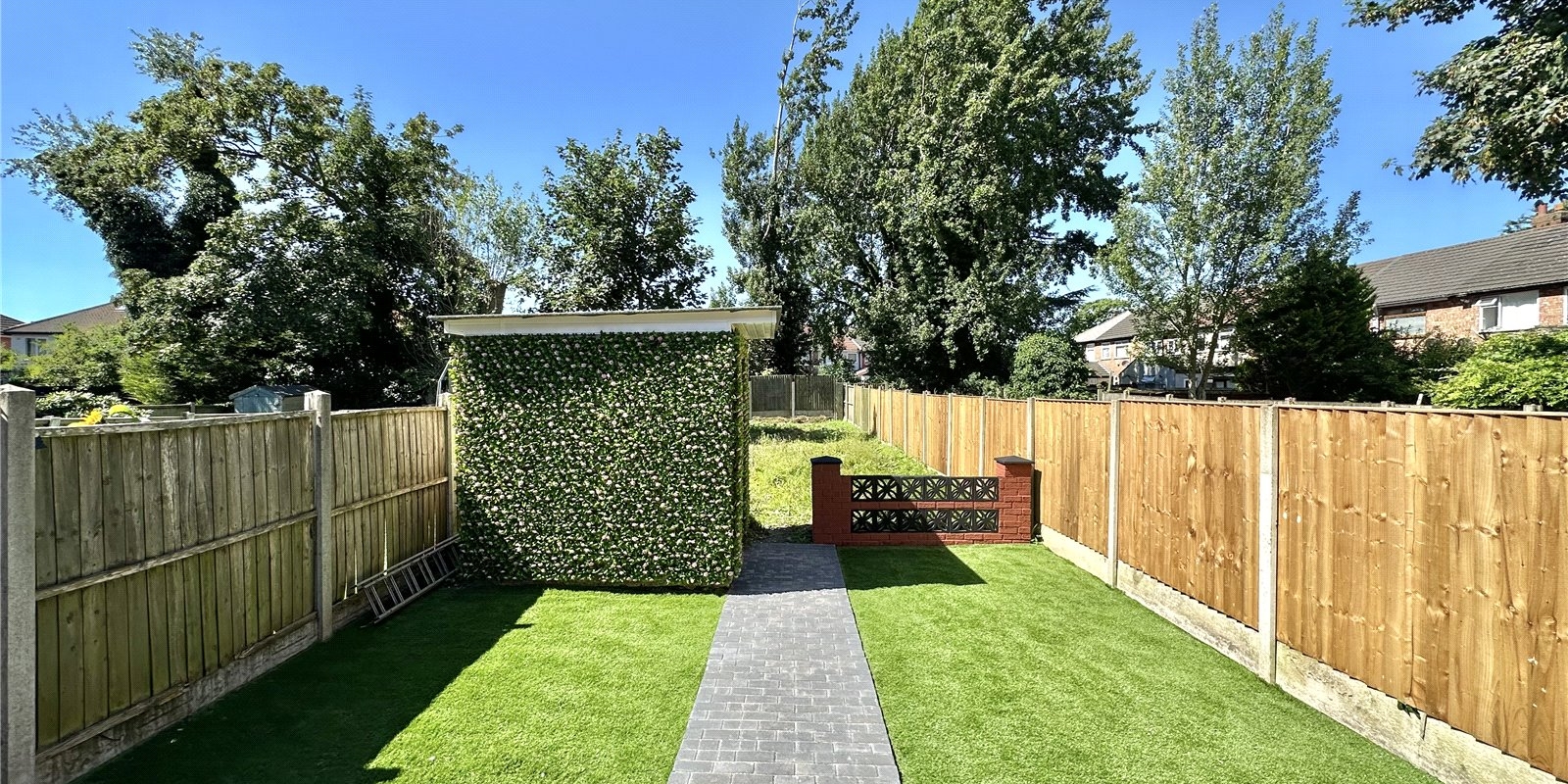 The rear of the property features a substantial garden, ideal for outdoor activities and gatherings. The garden includes a block-paved patio area, perfect for al fresco dining, and an expanse of artificial grass, ensuring low maintenance and year-round greenery. An outbuilding, equipped with electricity and lighting, provides additional versatile space for a home office, gym, or storage.