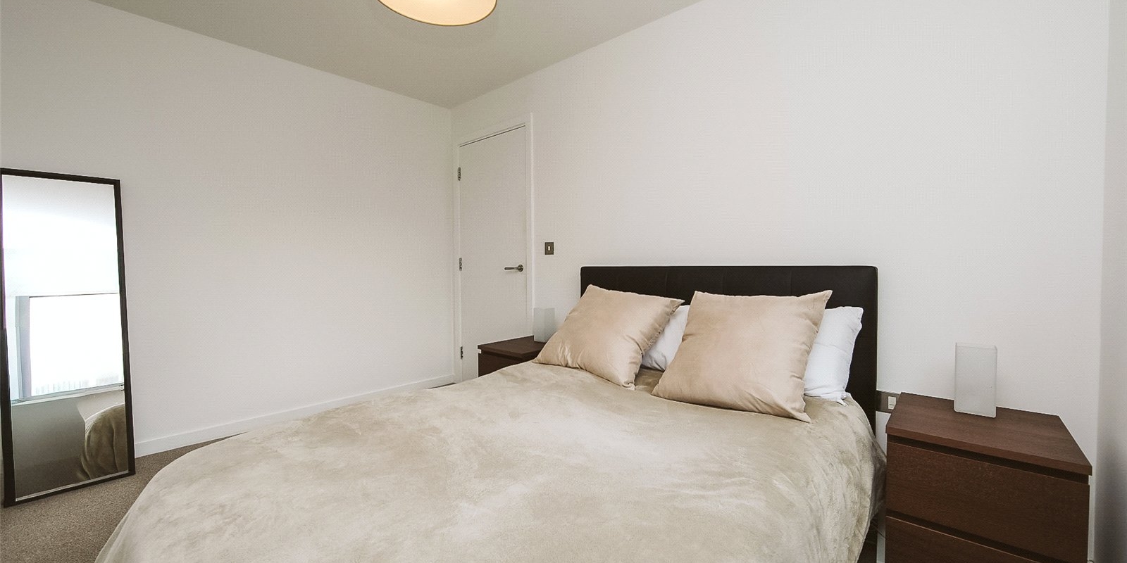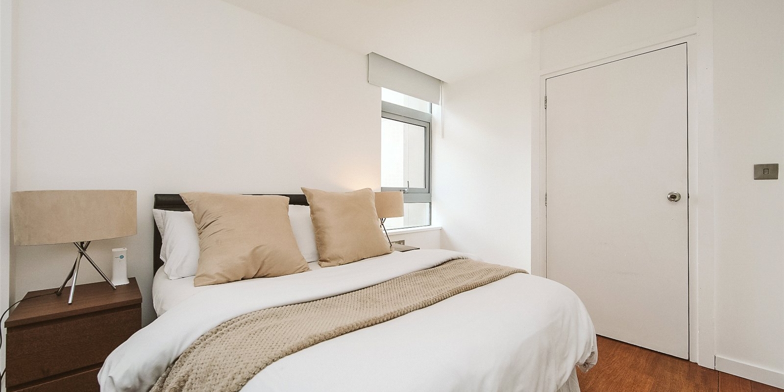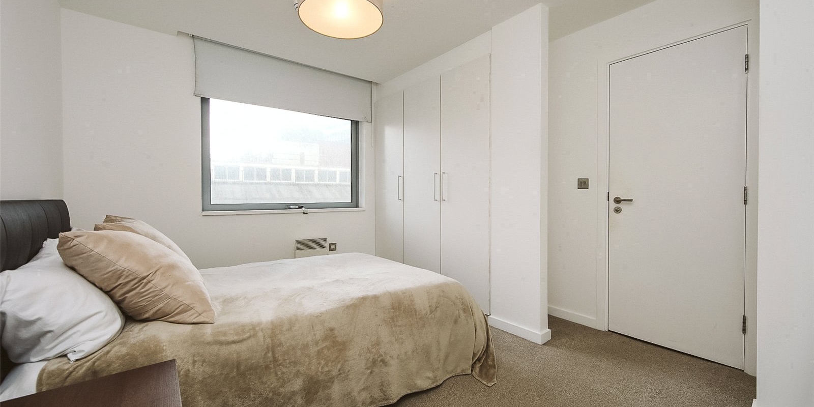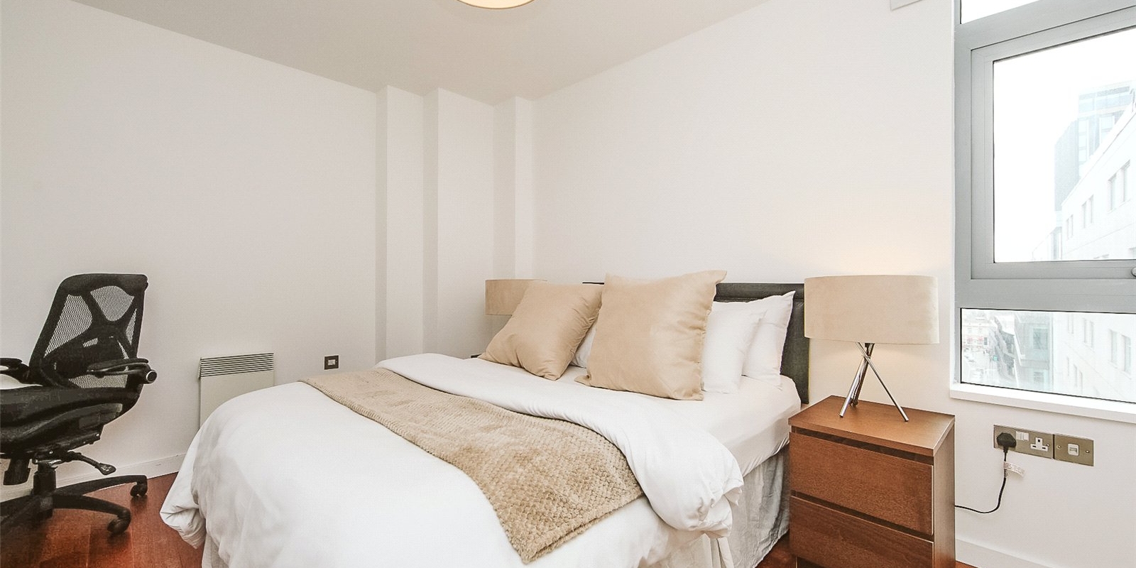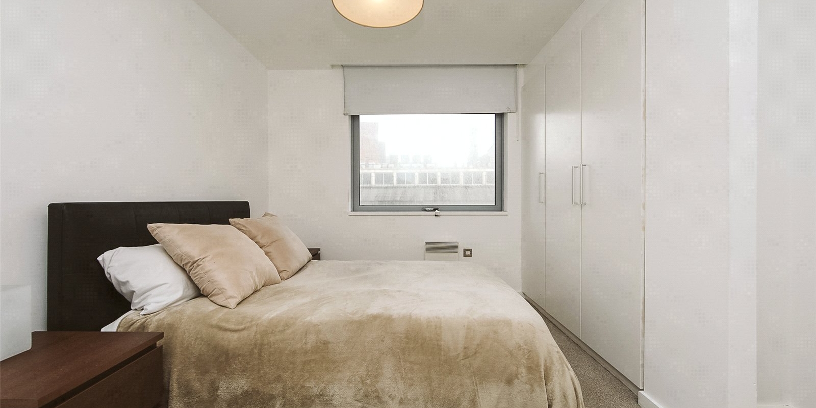 Both bedrooms are generously sized, with the master benefiting from built-in storage and en-suite. The sleek bathroom is finished to a high standard, and the property includes secure entry, lift access, and 24-hour concierge service.