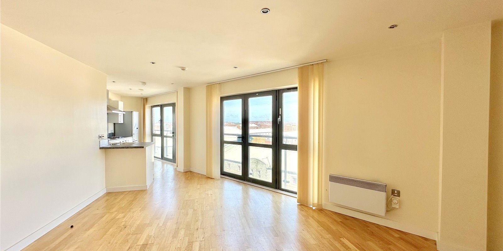 Upon entering, you’re welcomed by a spacious entrance hall that flows seamlessly into an open-plan lounge-diner and kitchen area. Featuring integrated appliances and elegant Juliette balconies, this bright and airy living space is ideal for relaxation or entertaining. The apartment also includes a generous double bedroom and a contemporary three-piece family bathroom.