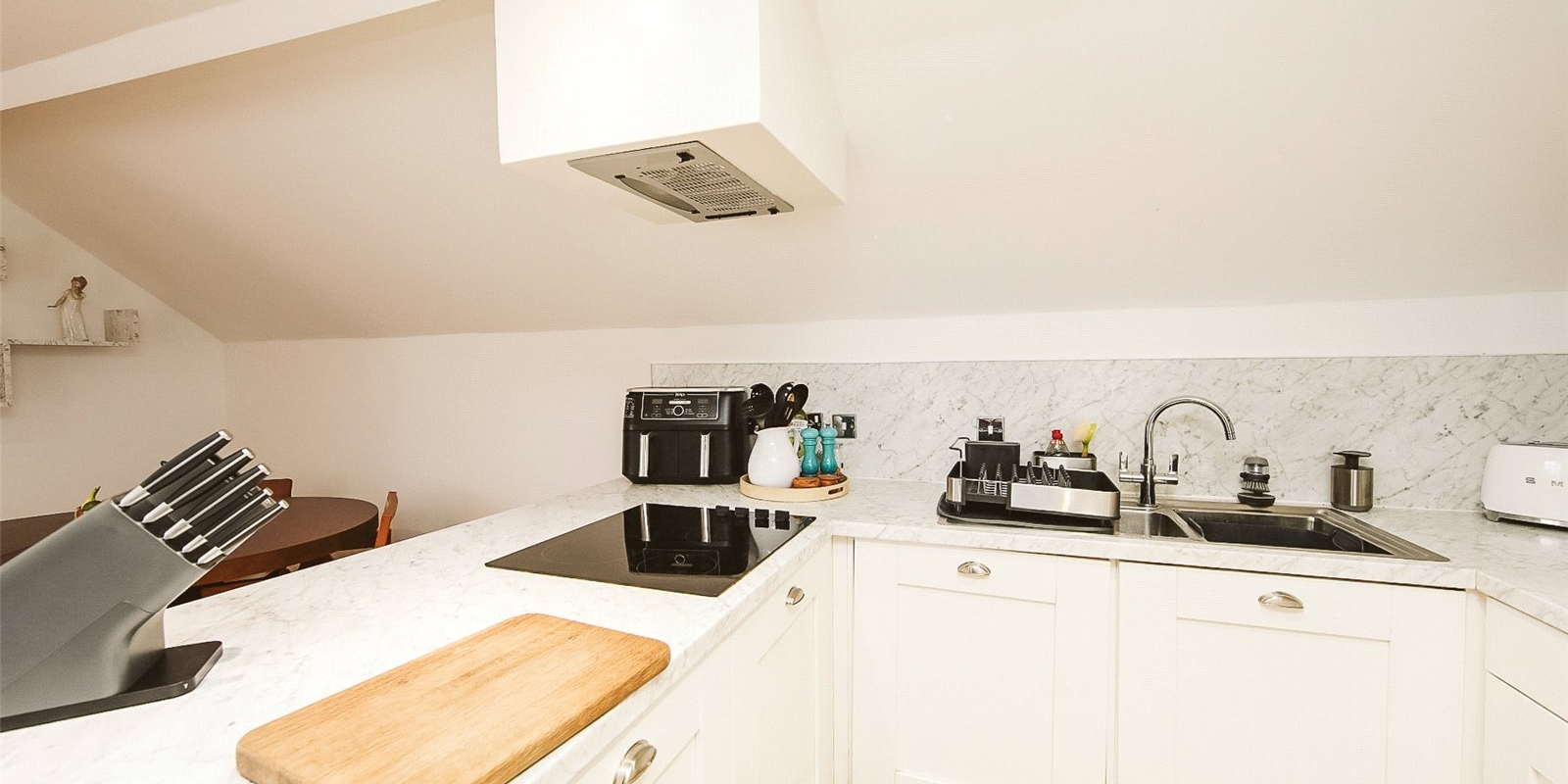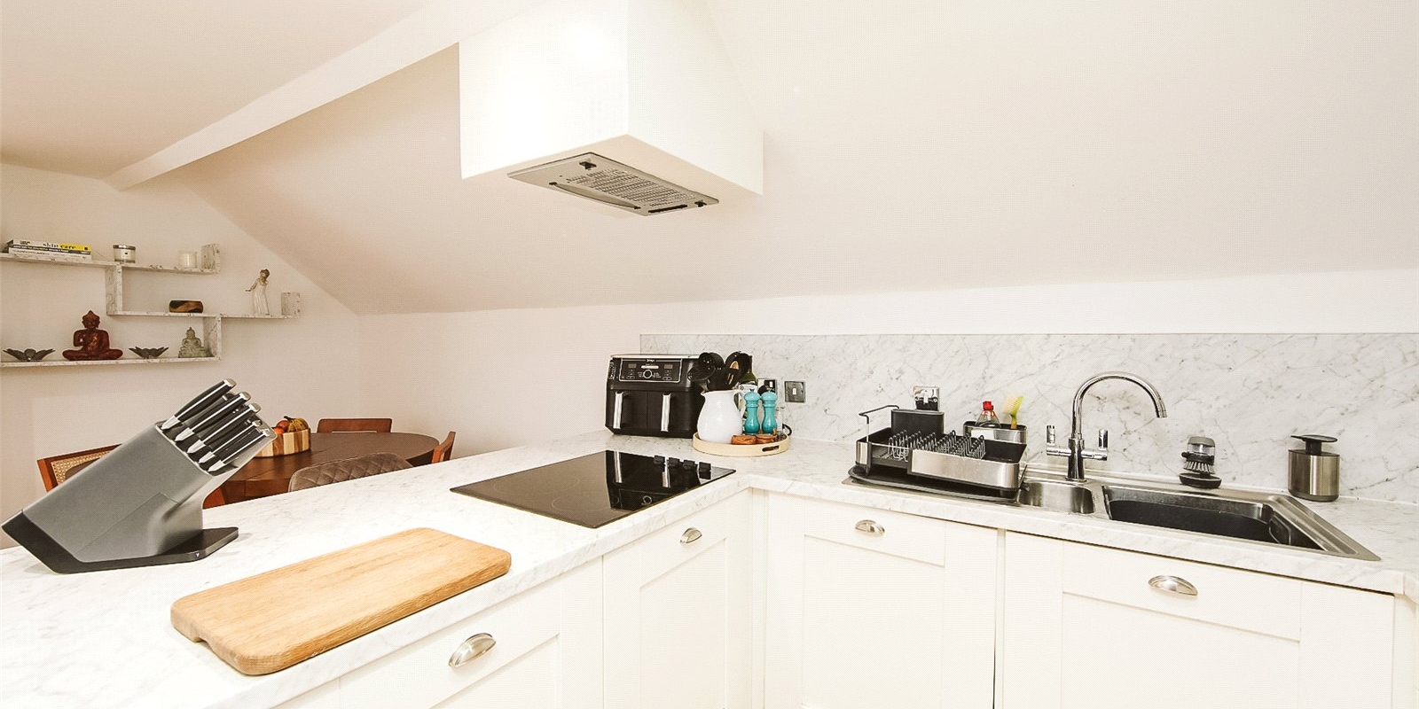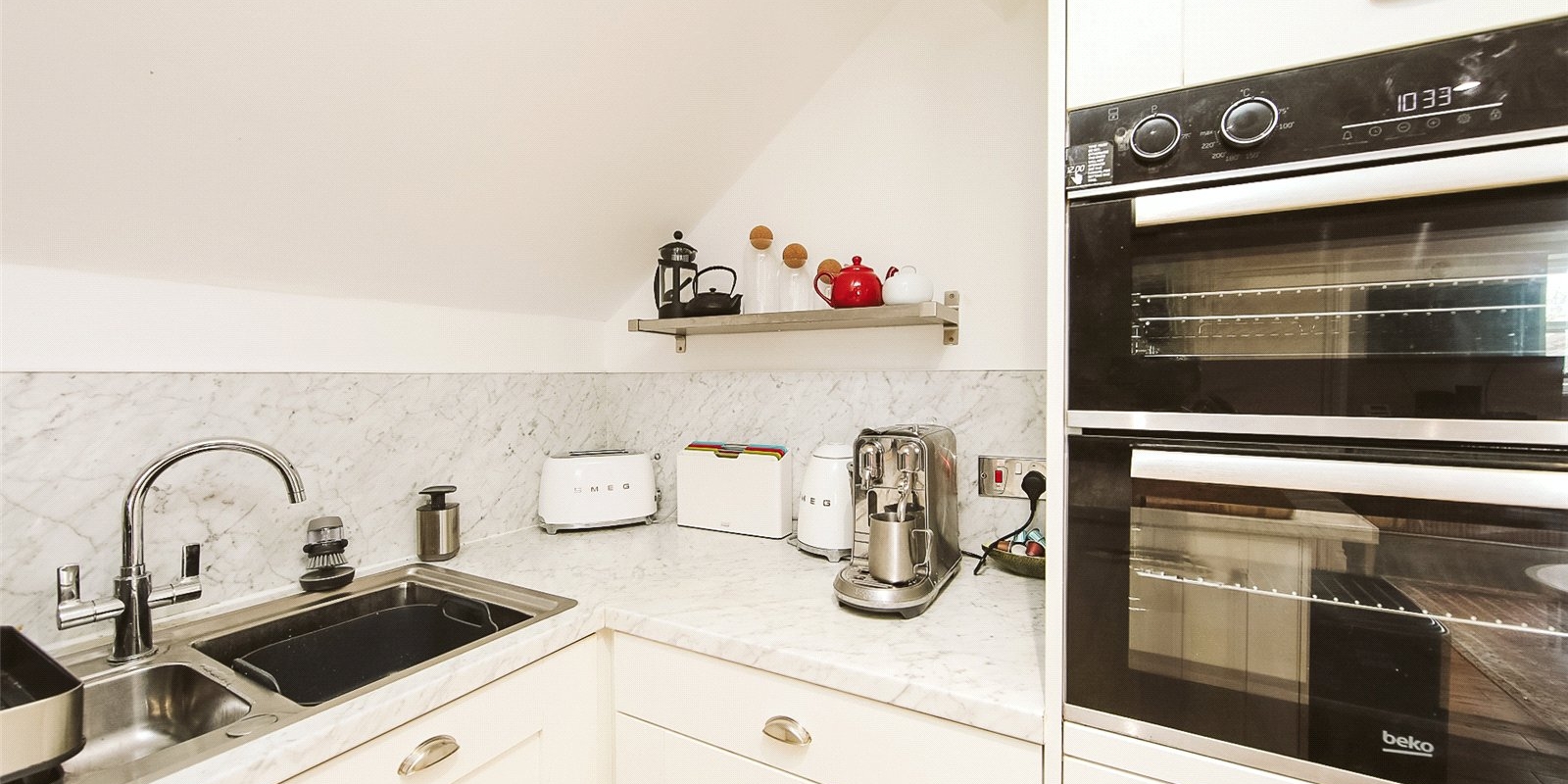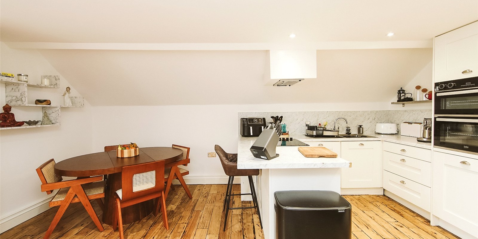 The kitchen is modern and well-appointed, fitted with high-quality integrated appliances including an oven, hob, fridge/freezer, and dishwasher. Its neutral palette allows you to easily add your own decorative flair.