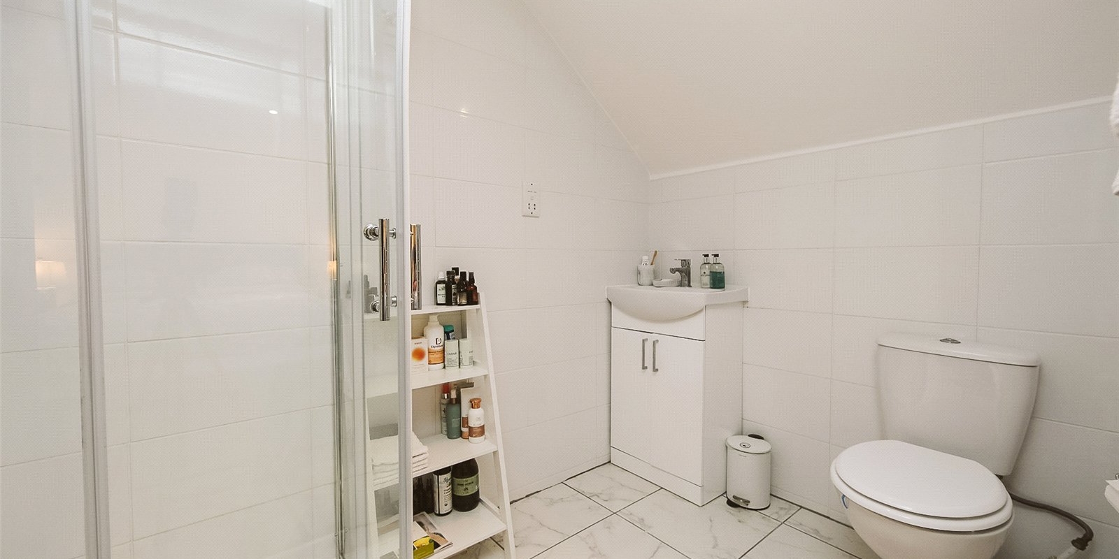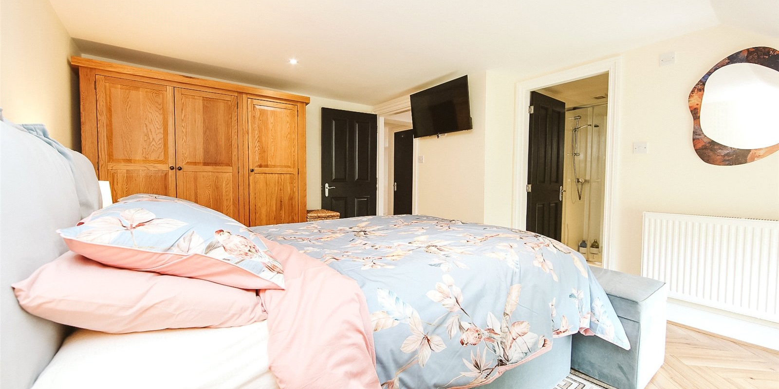 The master bedroom is a peaceful retreat, offering ample space, plenty of natural light, and fitted storage options. It benefits from a private en-suite shower room with contemporary tiling and fittings in a neutral, timeless design.