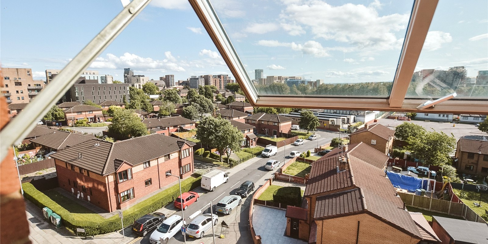 Positioned within a prestigious development, the apartment boasts a contemporary layout spread across two floors, designed to maximise both space and natural light. The upper floor features an expansive open-plan living, dining, and kitchen area, fully fitted with high-quality appliances and stylish finishes. Floor-to-ceiling windows and sliding glass doors open onto a private, newly decked balcony, providing spectacular panoramic views across Liverpool’s dynamic cityscape—an ideal spot for entertaining or relaxing.
