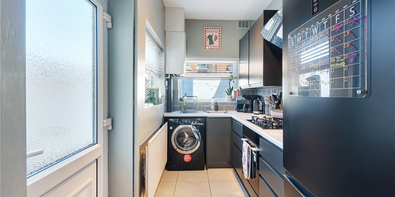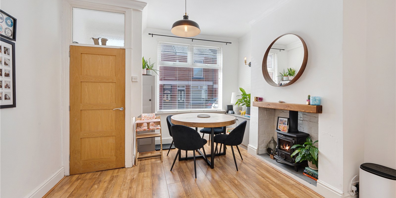 The ground floor boasts a bright and spacious open-plan layout, featuring two versatile reception areas centered around a charming feature log burner, ideal for both relaxing evenings and entertaining guests. The contemporary kitchen is beautifully designed with sleek matt-finish units, offering both functionality and a modern aesthetic.