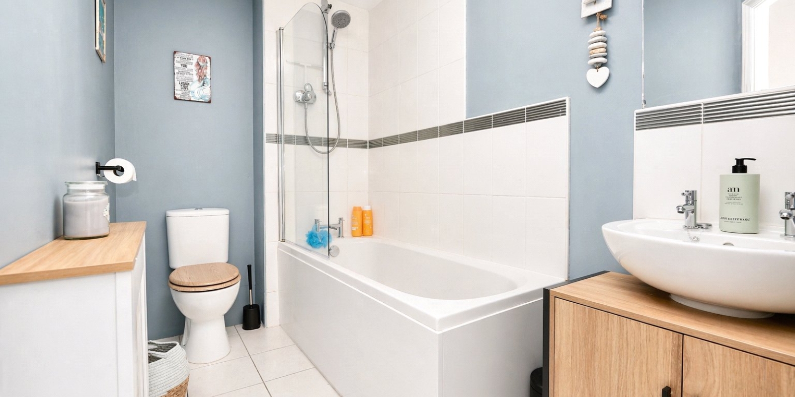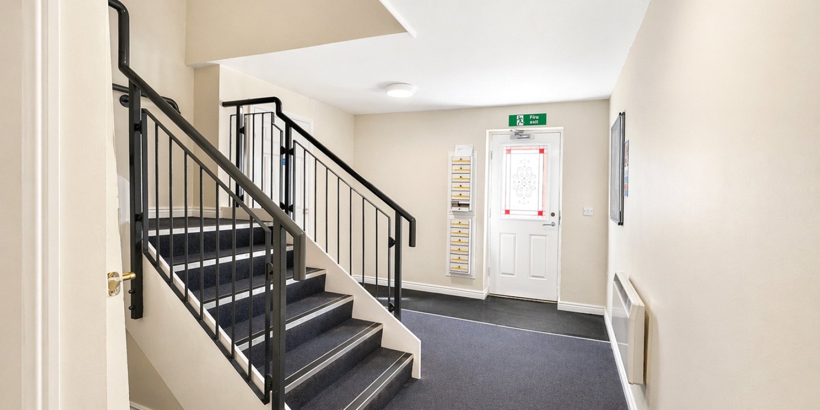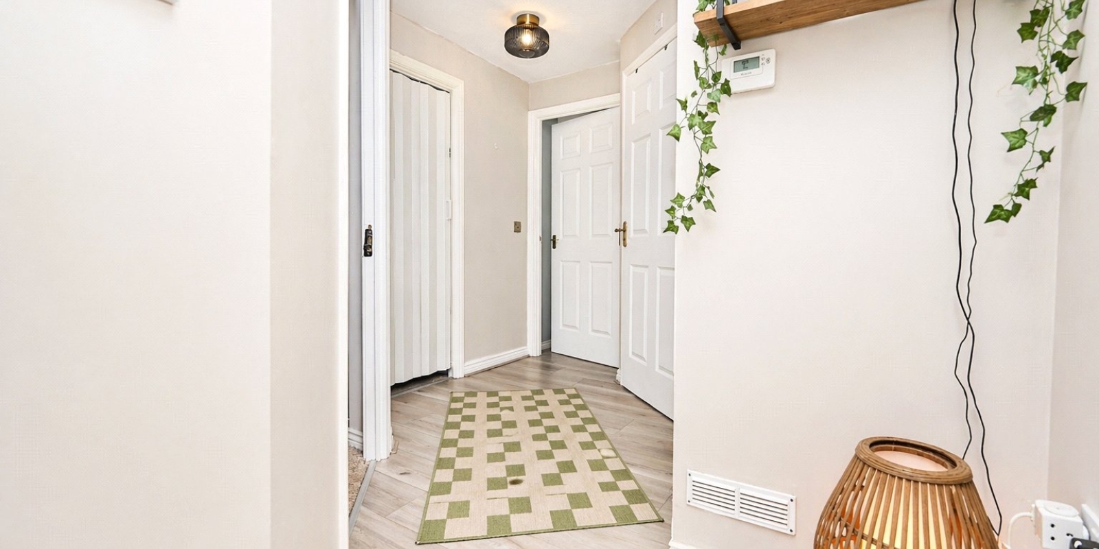 Two double bedrooms provide generous space for relaxation, while a modern three-piece bathroom suite with an overhead shower completes the home. Additional storage is available in a convenient hall cupboard, enhancing the apartment’s functionality.
