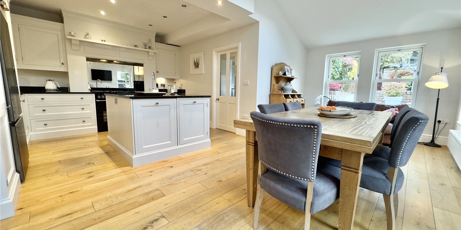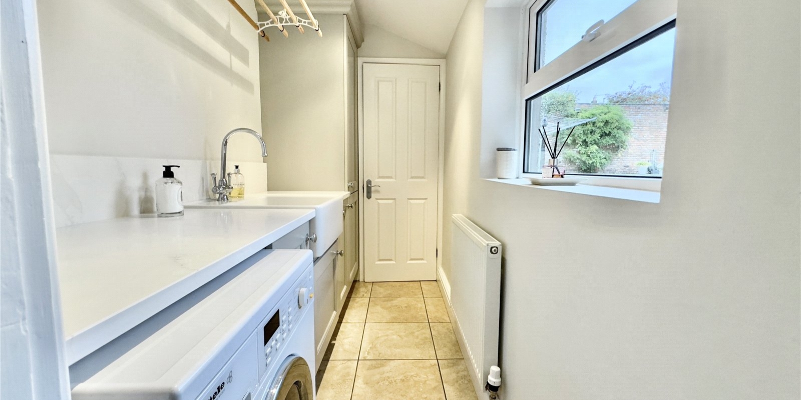 At the rear of the home lies the true hub of the property – a handcrafted kitchen and dining space by renowned designer Merilyn Phillips. This exceptional kitchen features bespoke wall and base units, a central island, high-end integrated appliances, and a vaulted ceiling over the dining area, creating a bright and airy atmosphere. Just off the kitchen, an inner hallway connects to a practical utility room and a downstairs WC, completing the ground floor layout.