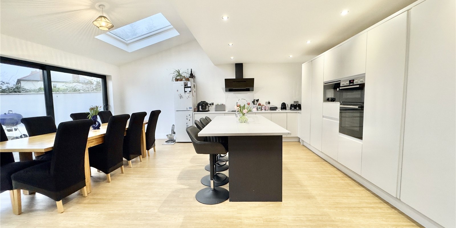 Upon entering, you are welcomed by a generous entrance hallway with a downstairs WC. To the front of the property are two well-proportioned reception rooms, offering flexible living or home-working space. To the rear is the true heart of the home — a superb open-plan kitchen, dining and family area, flooded with natural light from Velux windows and sliding doors opening directly onto the rear garden.