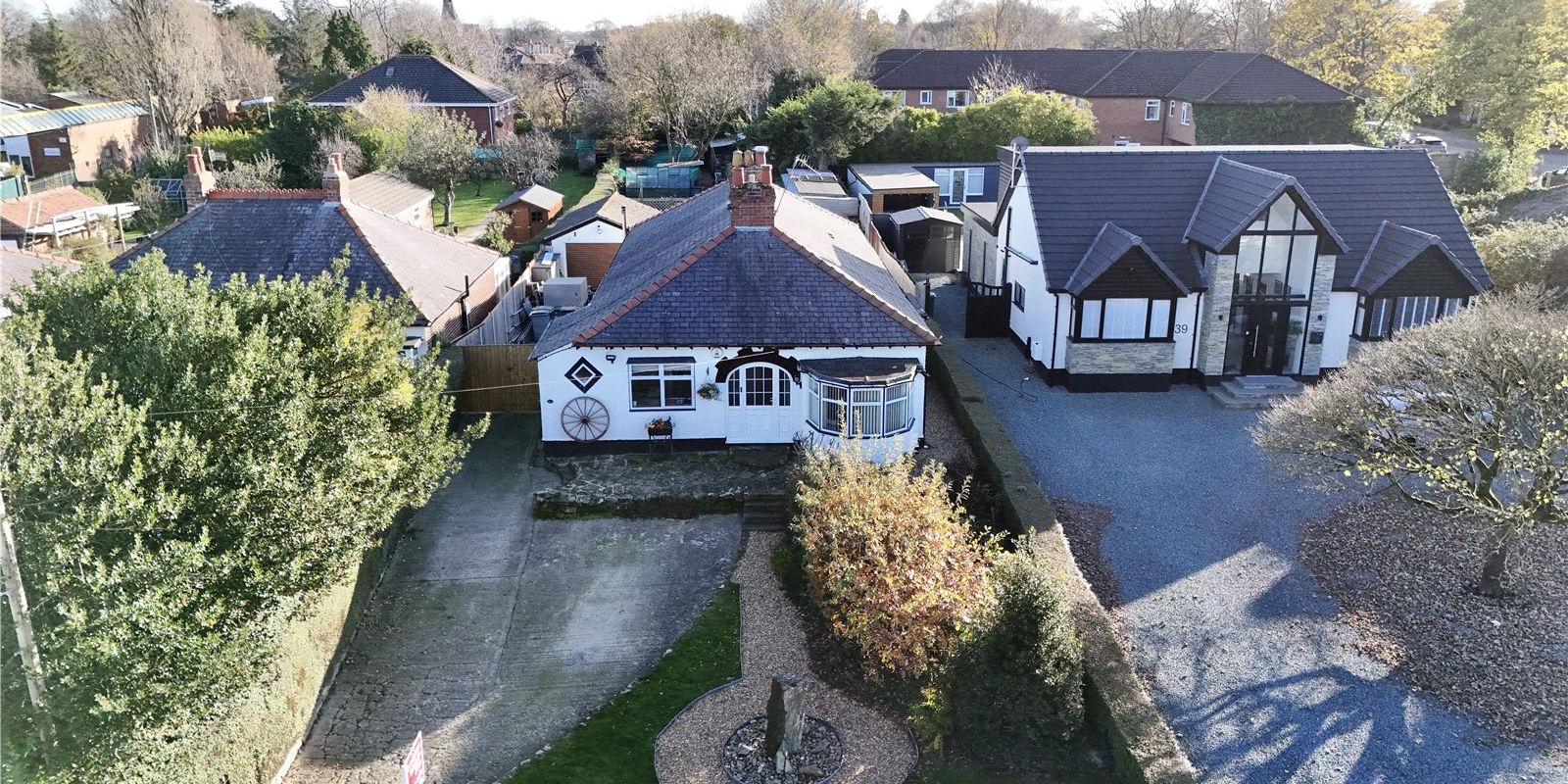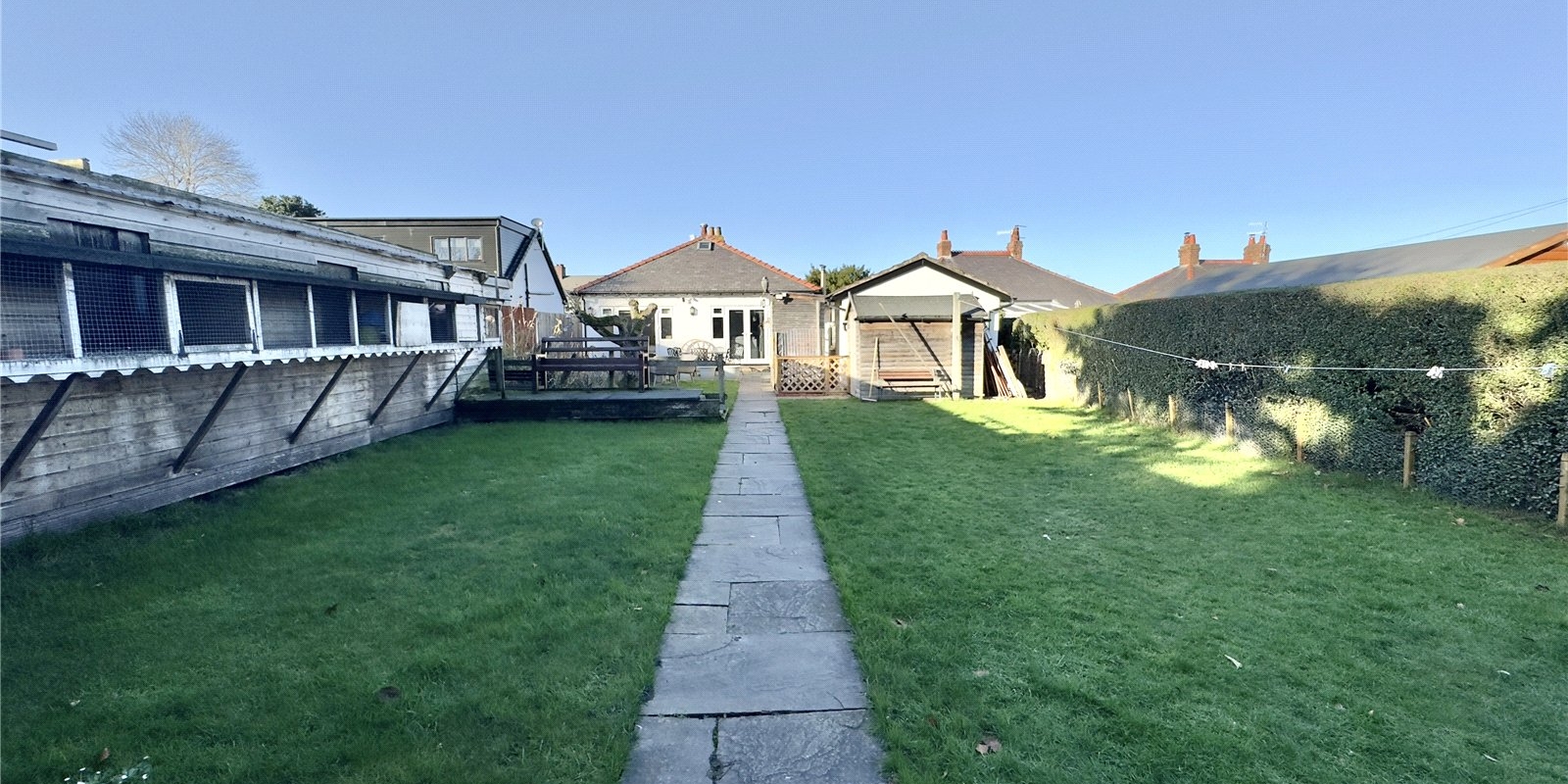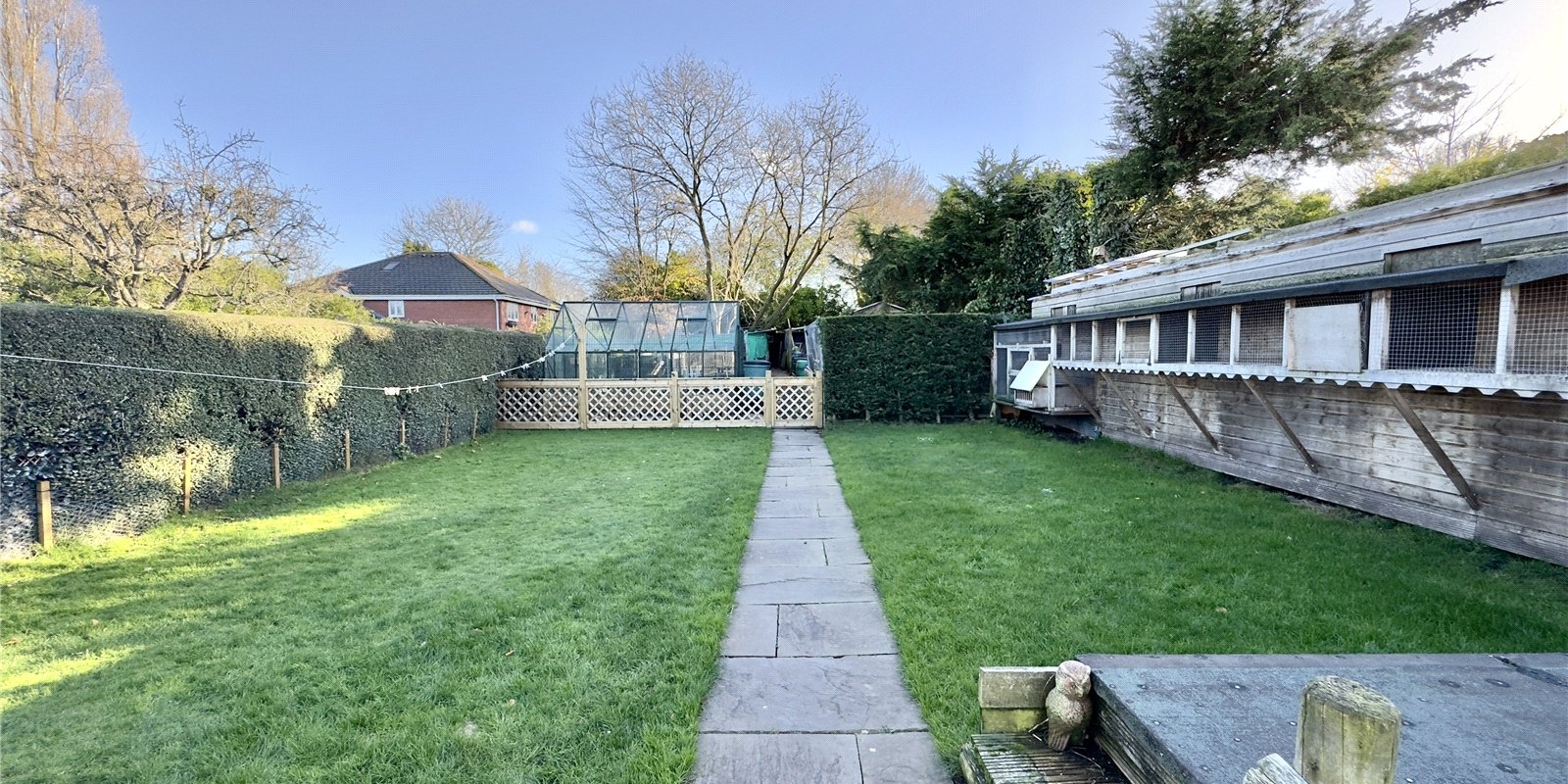 Set on a substantial plot, this characterful bungalow is approached via a long driveway providing off-road parking for numerous vehicles, leading to a detached garage. The generous frontage creates an immediate sense of privacy and space, while the vast rear garden is an outstanding feature of the home. The current owners have previously utilised the garden for ponies, hens and exotic birds, while the main garden area includes a patio, lawn, pond and pigeon coop – offering huge versatility for families, hobbyists or anyone seeking outdoor space on a rare scale.