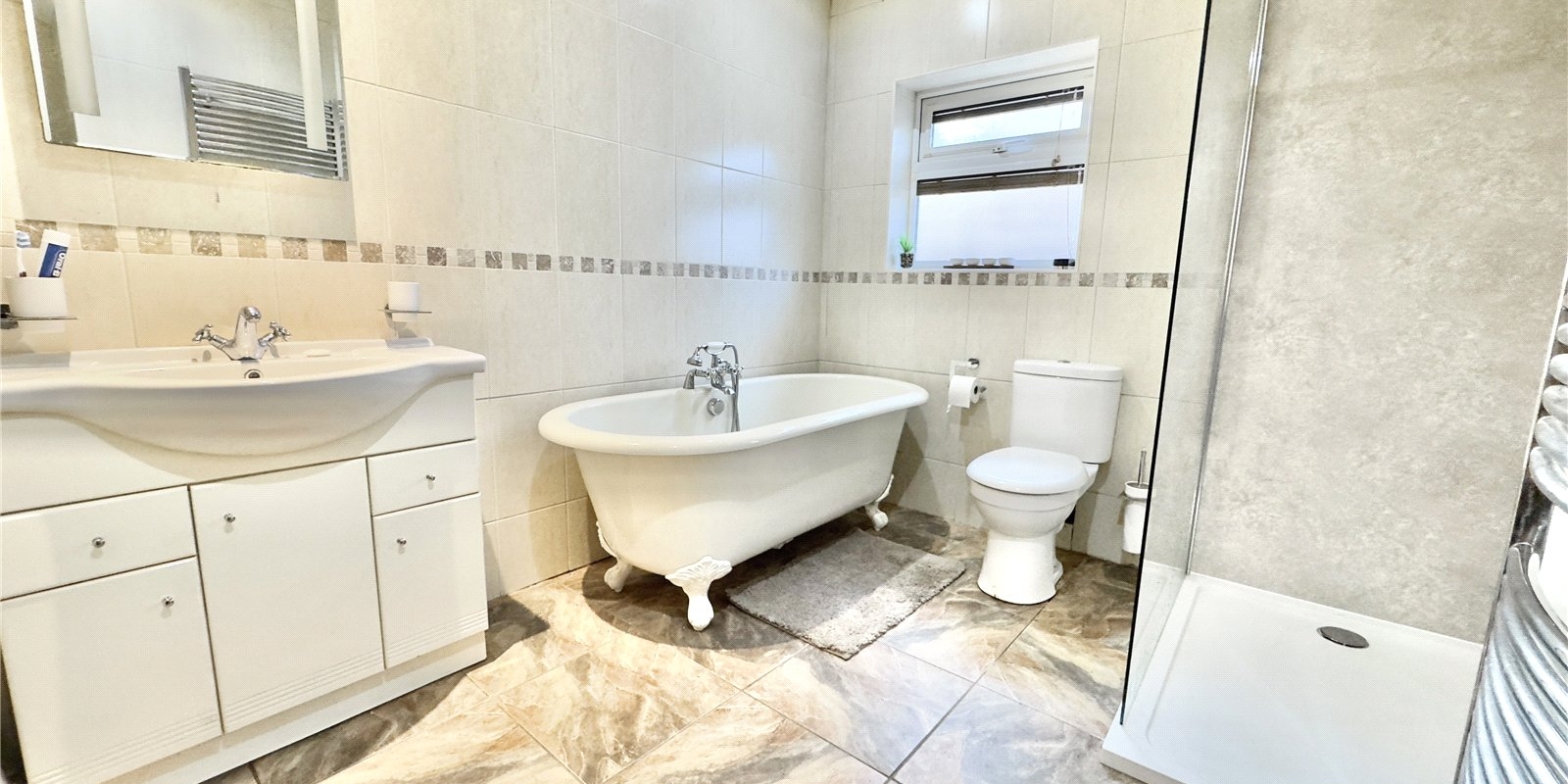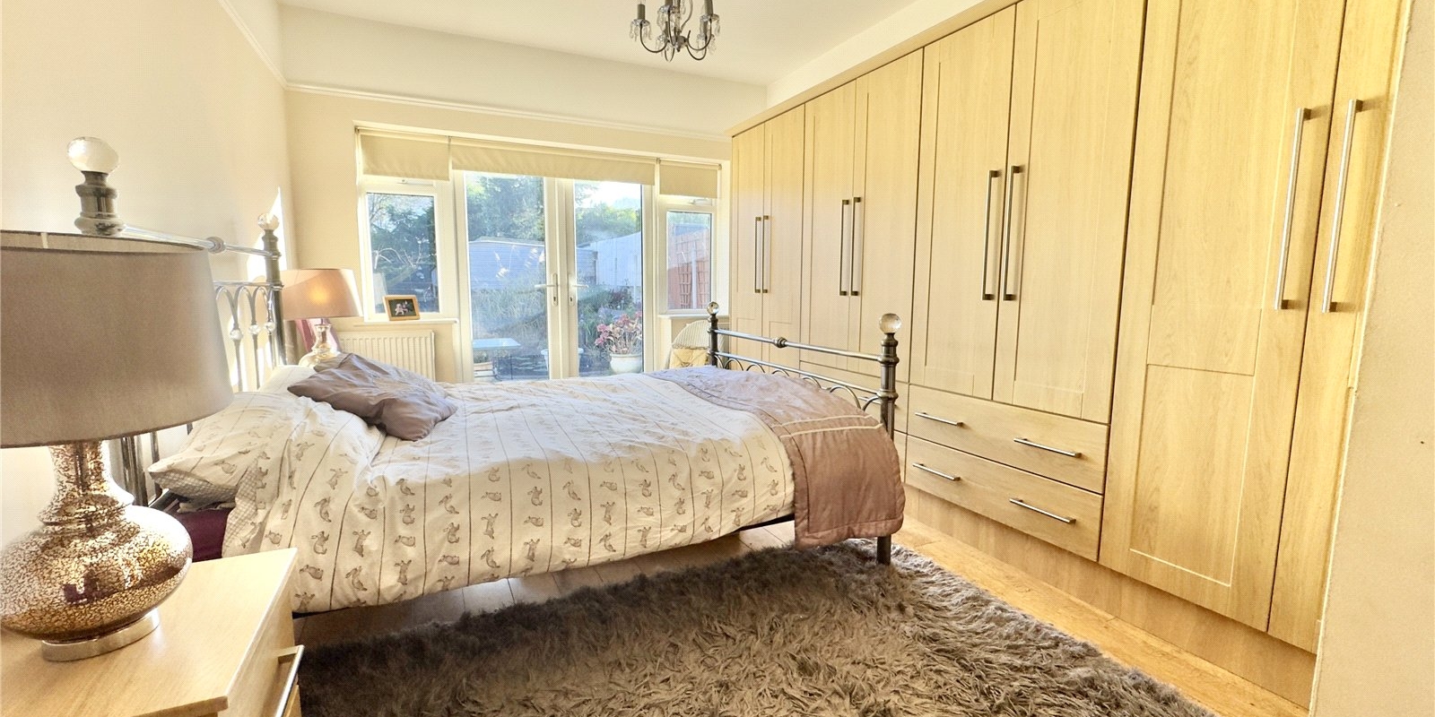 There are three double bedrooms in total. The impressive master suite forms part of the rear extension and benefits from an en-suite shower room and French doors opening directly onto the garden. One of the additional double bedrooms offers an en-suite WC, making it ideal for guests or family members.