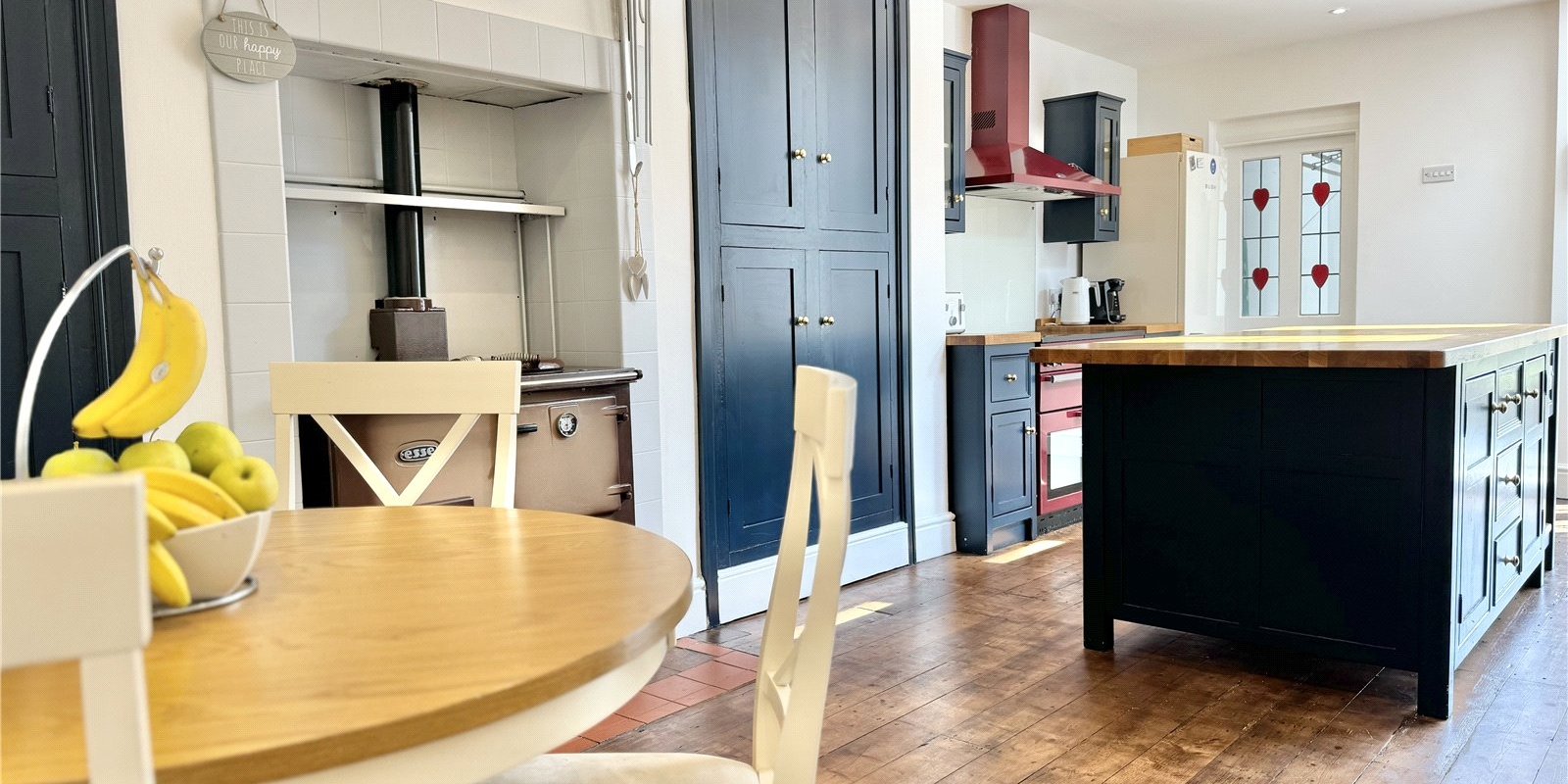 The heart of the home is the beautiful traditional-style kitchen/breakfast room, featuring a charming pitched ceiling, rich navy cabinets, a breakfast island with a solid wood work surface, a range cooker, and an Aga—meaning you can always cater for all the family Christmases—and access to the fantastic entertainment garden through patio doors.