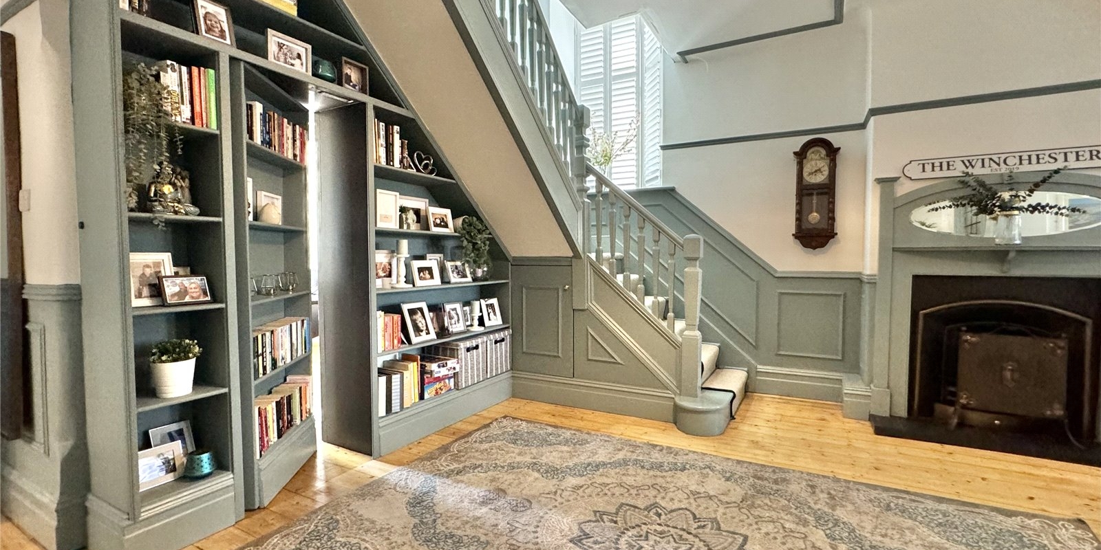 In the hallway, a secret bookcase room adds an element of mystery and intrigue before discovering the media room behind, which boasts a panelled media wall and plenty of space for all the family.
