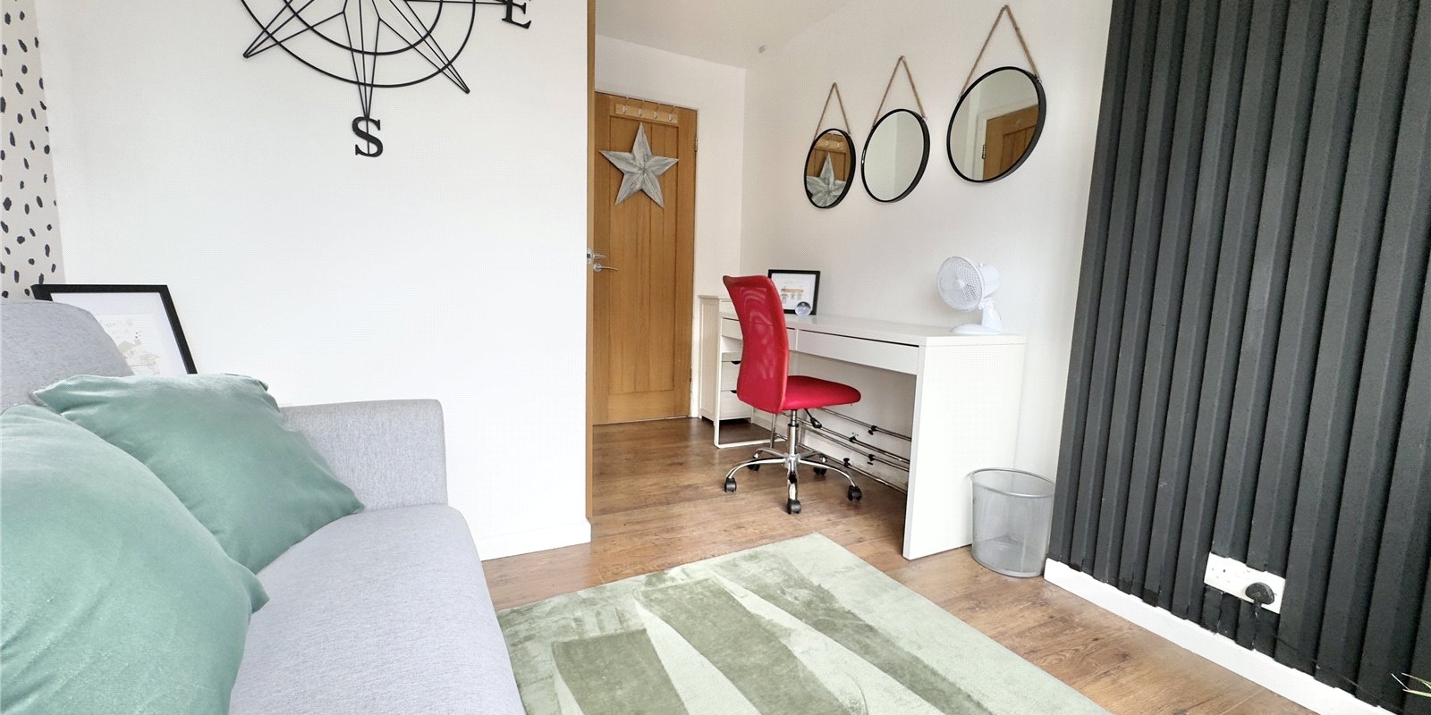 The fitted kitchen is spacious and stylish, featuring an array of wall and base units, ample complimentary worktops, and space for appliances. A window overlooks the rear garden, and a door provides further access to the outdoor space. An understairs cupboard offers additional storage. A door from the kitchen leads to a second hall, providing access to a versatile space currently used as a downstairs bedroom/home office, along with a downstairs WC. This area was originally a garage, thoughtfully converted to maximize the home's living space.