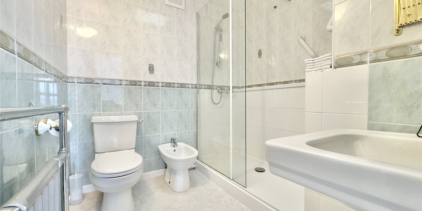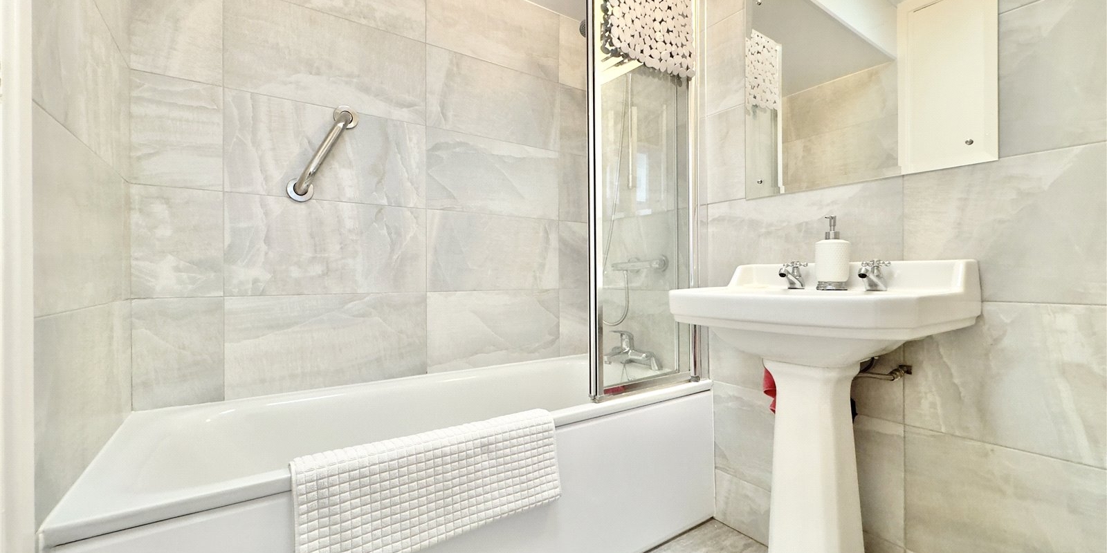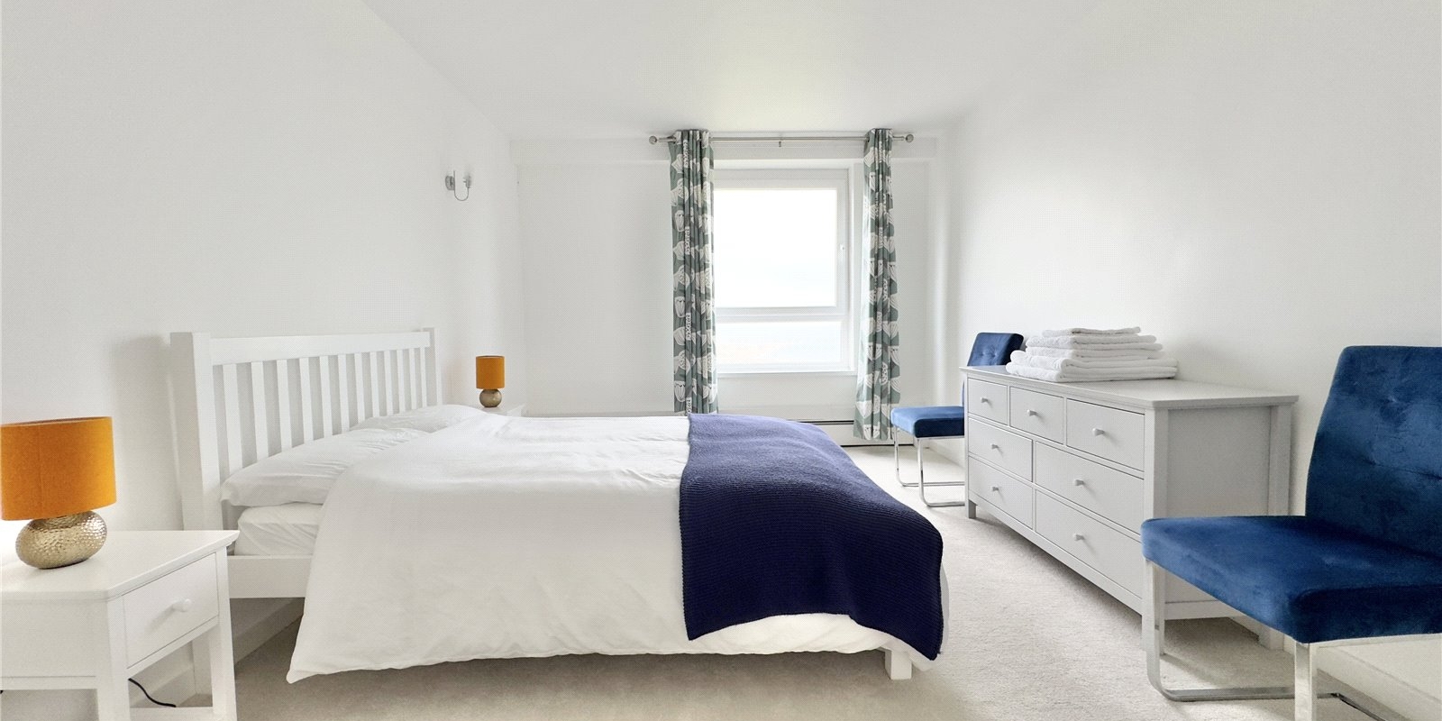 The contemporary bathroom in this penthouse is equally impressive. It serves as a tranquil oasis, featuring a neutral canvas enhanced by modern grey tiling on every wall. The modern suite is sleek and sophisticated, offering both style and functionality. High-quality fixtures and fittings complete the space, ensuring a luxurious experience every day.