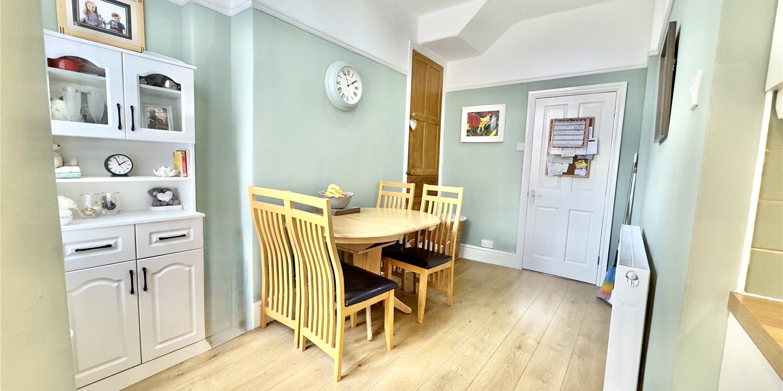 The accommodation begins with a welcoming vestibule that opens into a spacious entrance hall featuring original details and a useful understairs storage area. The front lounge enjoys a large bay window that floods the room with natural light, complemented by a feature fireplace that creates a warm focal point. A second reception room sits to the rear, offering a quiet space ideal as a sitting room, playroom or home office, with patio doors leading directly out to the garden. The dining area opens seamlessly into the kitchen, creating a sociable and practical layout perfect for family meals or hosting guests. The kitchen itself is well-equipped with a range of wall and base units, ample work surfaces and direct access to the rear garden, making indoor-outdoor living effortless throughout the year.