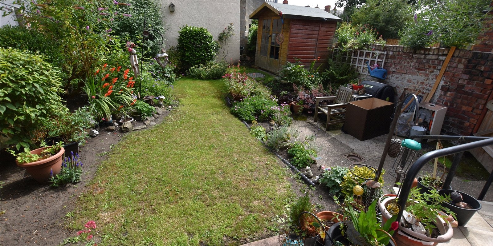 Externally, the property boasts a rare and generous rear garden for this area, featuring a well-maintained lawn, colourful mature borders, a wooden shed, and steps down leading to a patio—ideal for outdoor relaxation or entertaining. Neatly planted flower beds enhances the front approach, giving the home standout curb appeal.