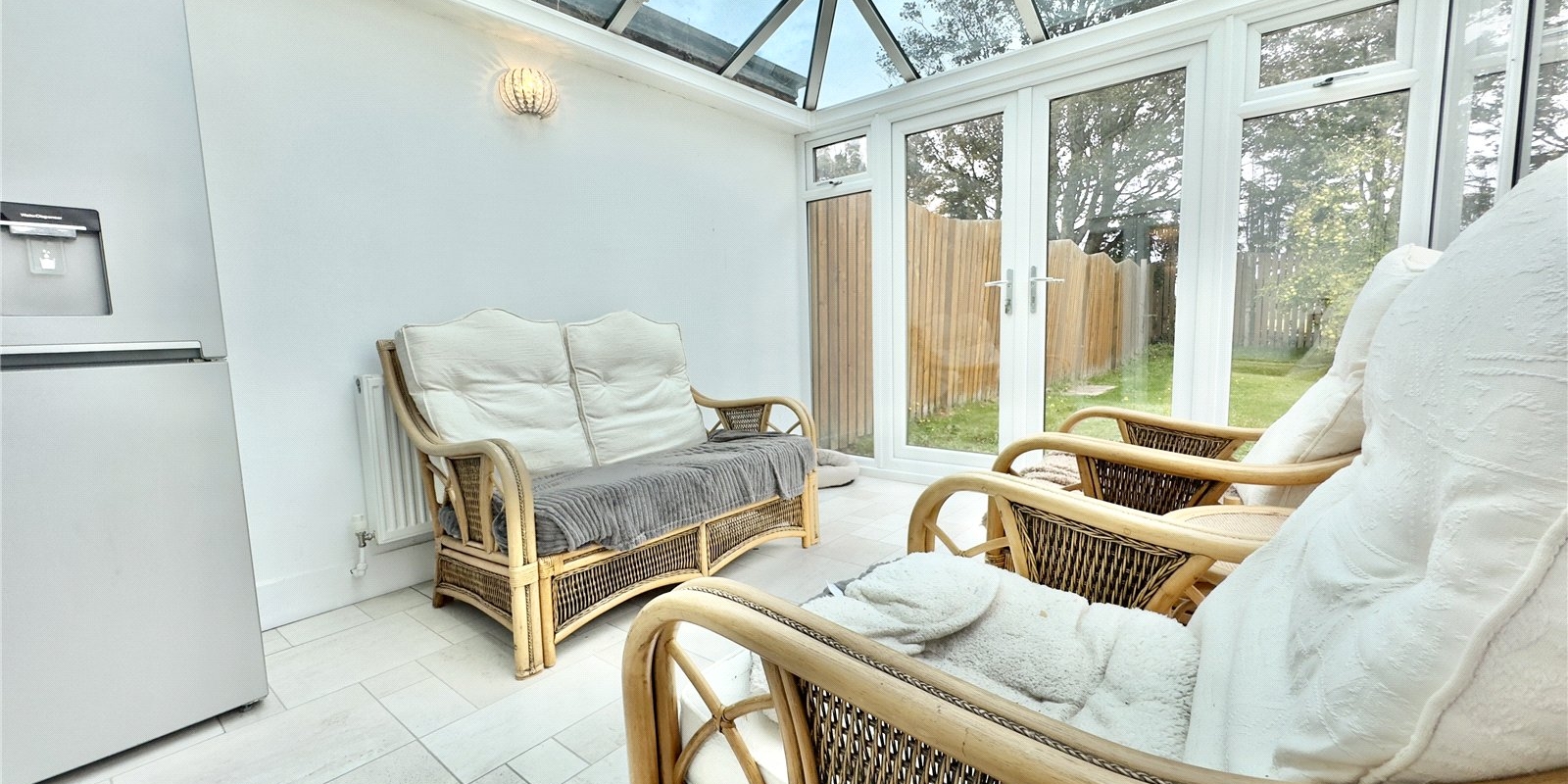The heart of the home lies in the fully renovated kitchen and dining area, designed with timeless navy cabinetry, brushed gold fittings, white quartz worktops, and white tiled splashbacks. A breakfast bar provides casual dining space, while the open-plan layout flows into a defined dining area with patio doors through to the conservatory—an additional seating area that enjoys lovely views over the rear garden. The kitchen also features a butler sink and integrated appliances for added convenience and style.