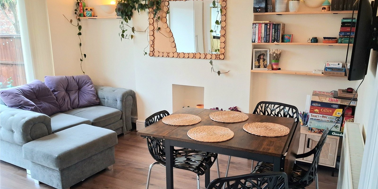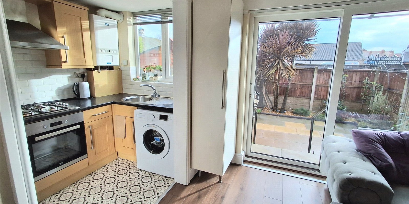 Stepping inside, the quality of the recent improvements becomes immediately apparent. The interior has been thoughtfully updated to create bright, comfortable and welcoming spaces throughout. At the heart of the home is the open-plan kitchen and dining area, which has been refreshed with contemporary finishes to offer an ideal setting for both everyday cooking and entertaining guests. French doors allow natural light to pour into the room and open directly onto the private, south-facing patio garden—an outdoor space that has been carefully looked after and designed for low-maintenance enjoyment.