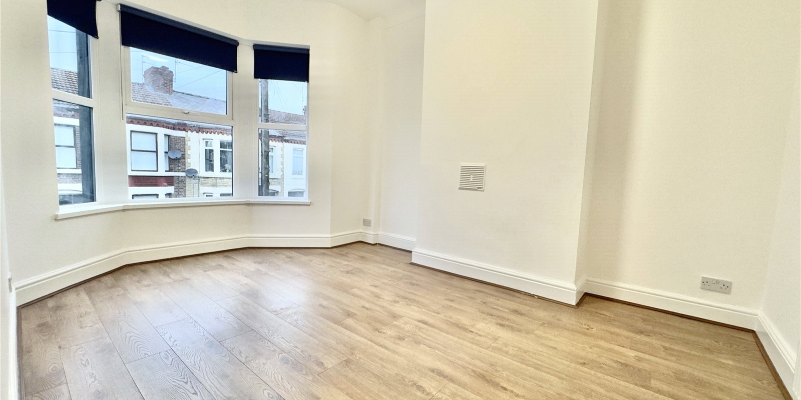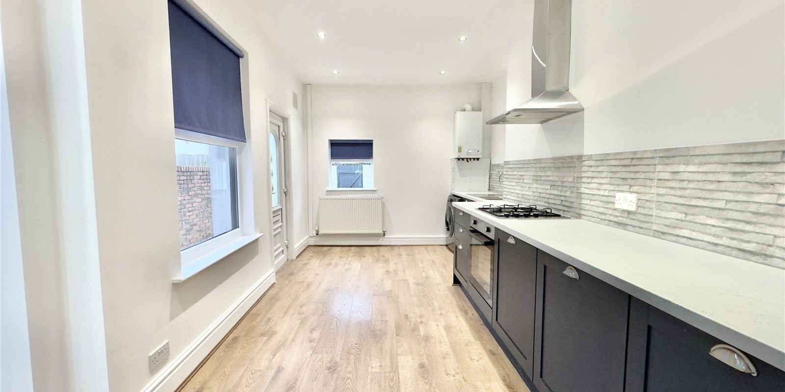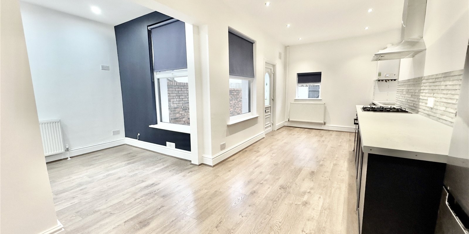 On entering the property you are welcomed into a bright hallway showcasing high ceilings and contemporary décor. The front lounge features a large bay window allowing natural light to flood the room, complemented by a striking navy feature wall. The hallway is open to a stylish fitted kitchen finished with navy cabinetry, contrasting white worktops and a grey splashback. This space opens seamlessly into the dining area, continuing the coordinated colour scheme with another navy feature wall. The open-plan layout is enhanced by multiple windows, creating a light and airy space perfect for both everyday living and entertaining. The rear courtyard is accessed directly from the kitchen.