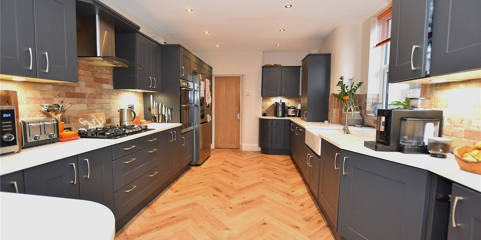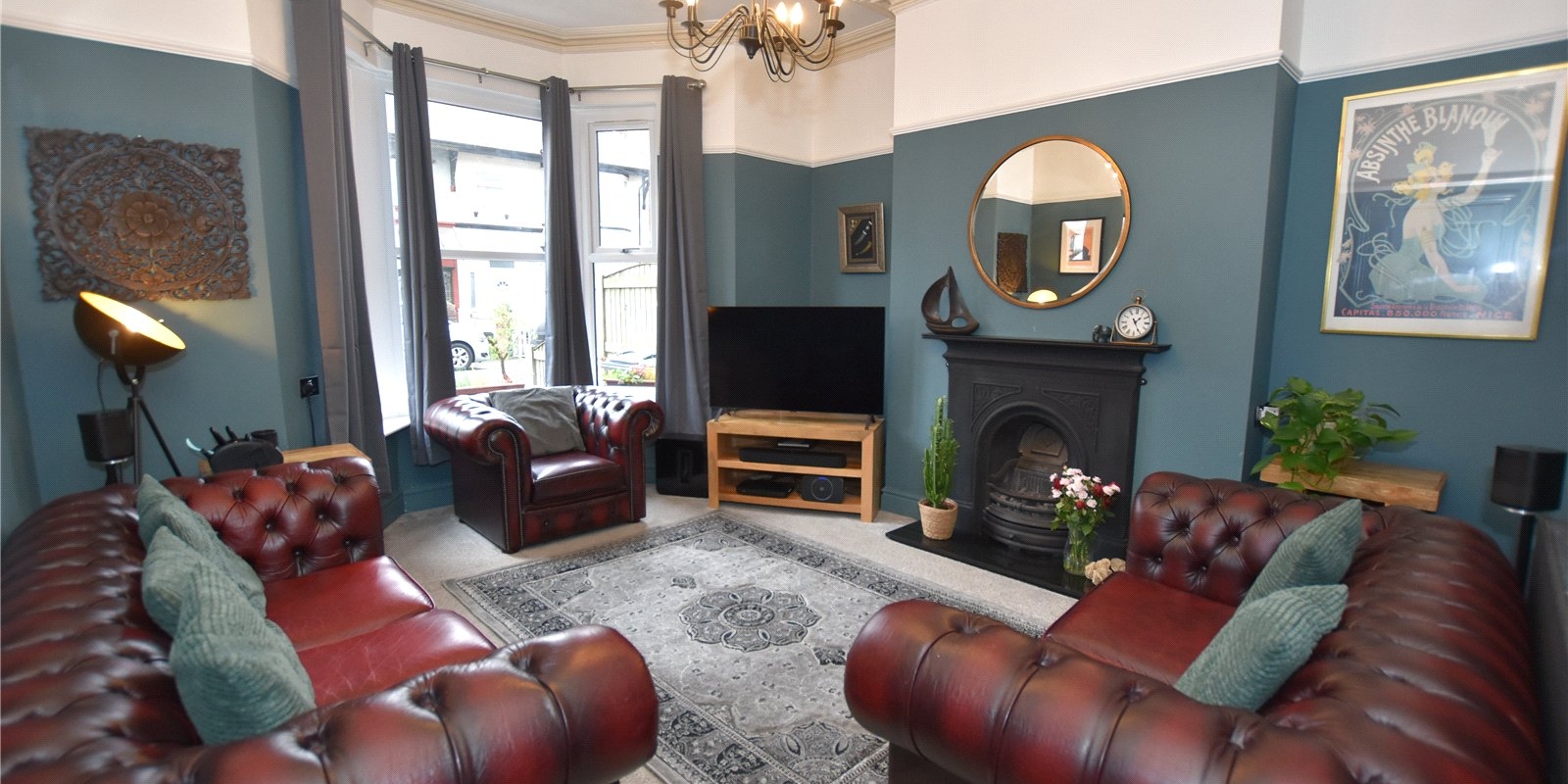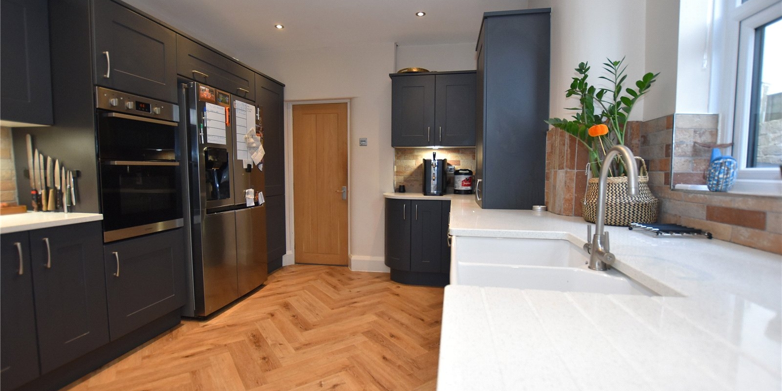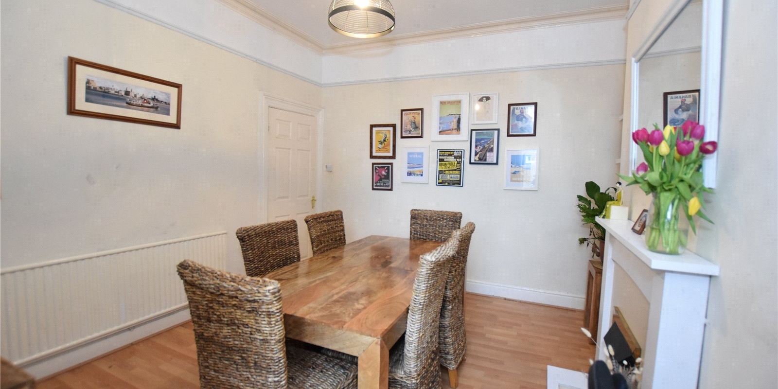 The property also benefits from two generous reception rooms. The front lounge is bright and welcoming, boasting a bay window and feature fireplace, while the second reception room offers versatility as a formal dining room, playroom or additional sitting room.