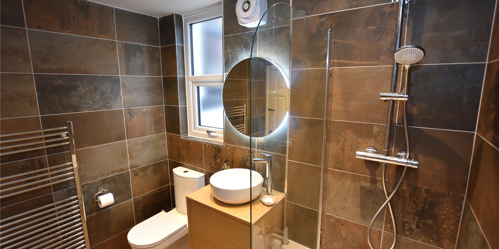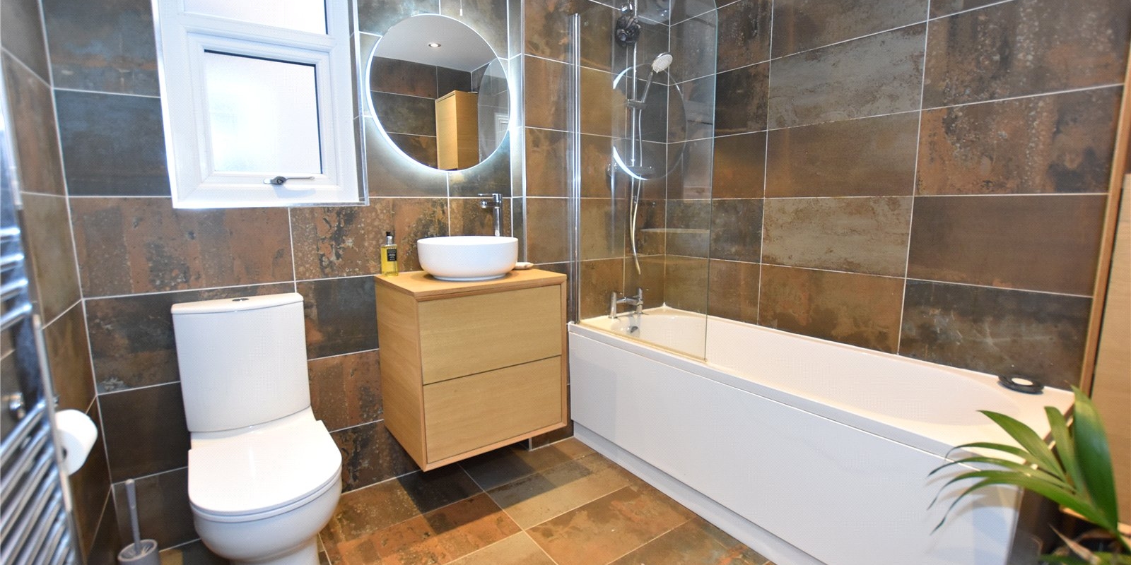 To the first floor are three well-proportioned bedrooms and a beautifully appointed modern bathroom. The bathroom comprises a bath with shower over, a warm wood vanity unit, and fully tiled walls in stunning terracotta-brown marble-effect tiles, creating a luxurious yet inviting finish.