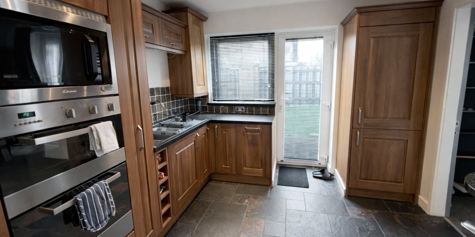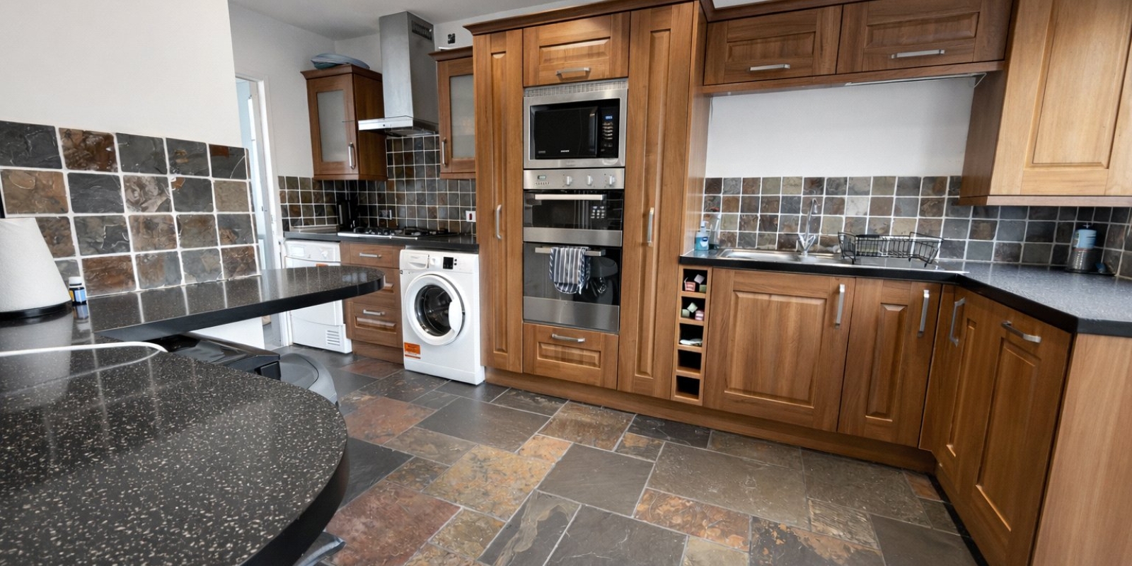 The fitted kitchen is well arranged with a good range of units and work surfaces, catering comfortably to modern family needs.