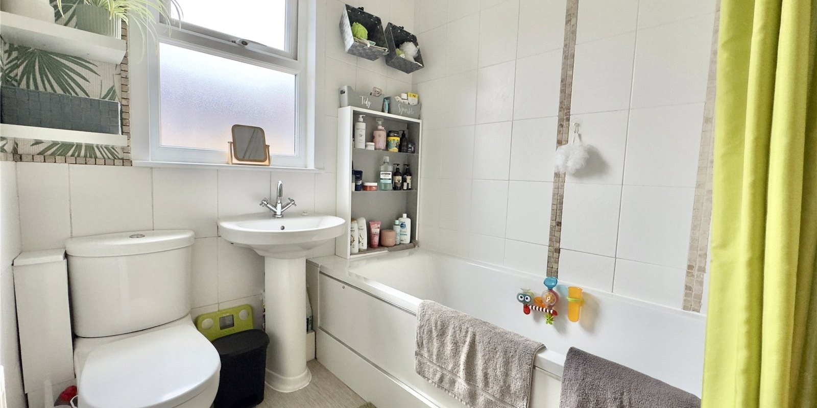 The modern family bathroom is finished with sleek white tiling, elegant stone mosaic border detailing and striking feature wallpaper, creating a stylish and tranquil space.