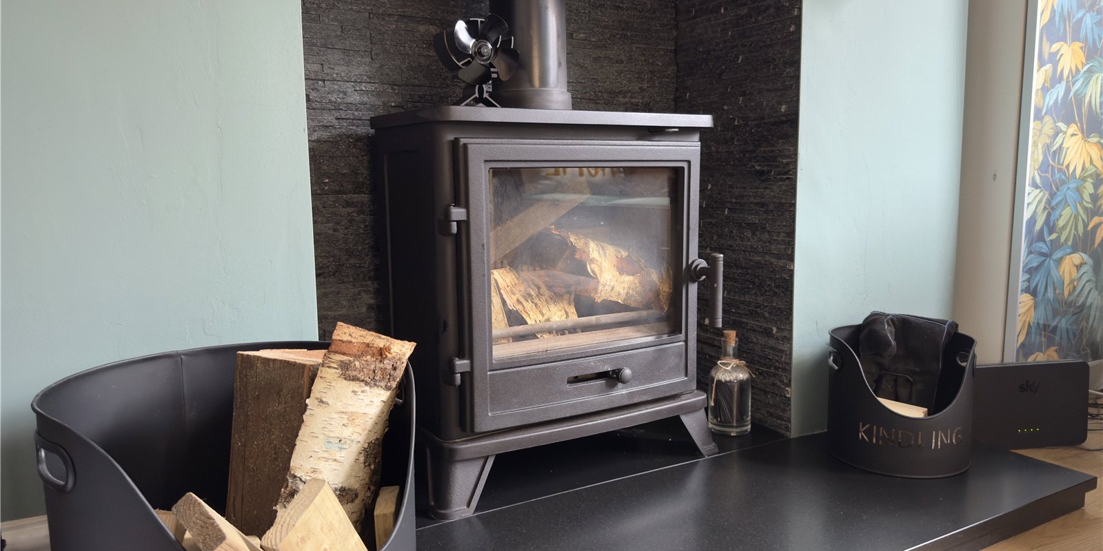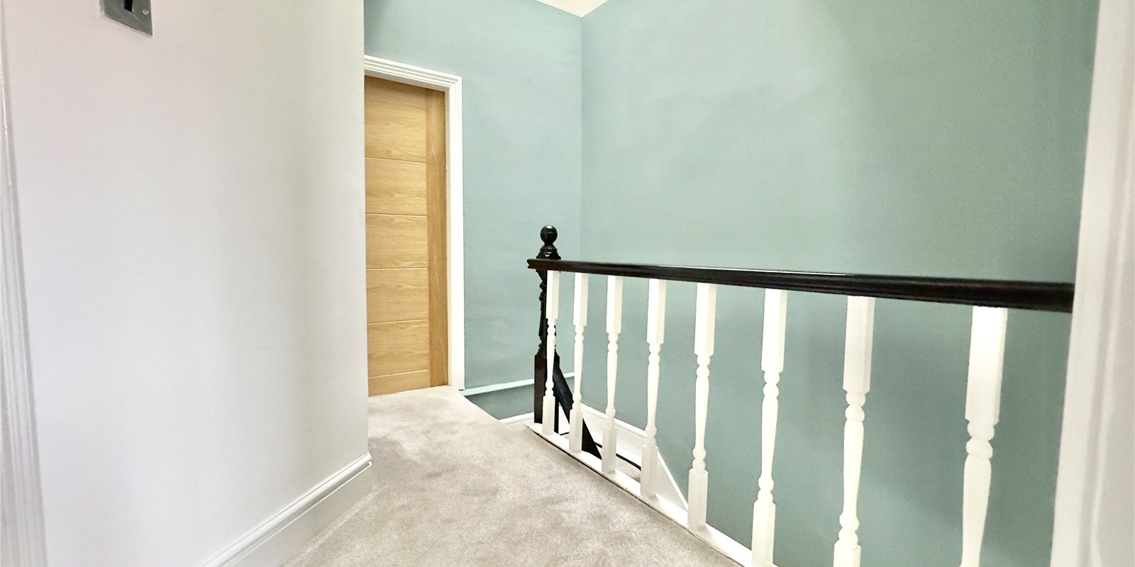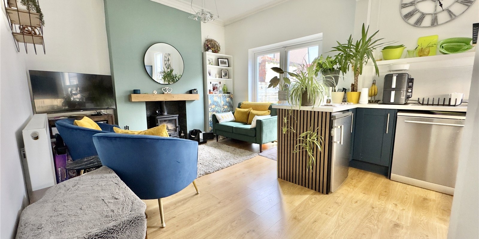 To the front of the property, the welcoming reception room features a beautiful bay window fitted with bespoke upvc blinds, a feature fireplace with a modern electric fire, plush carpeting and rich teal walls complemented by tasteful wallpaper. This cosy yet stylish room provides the perfect setting for relaxing with family.