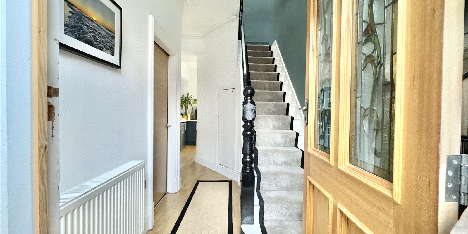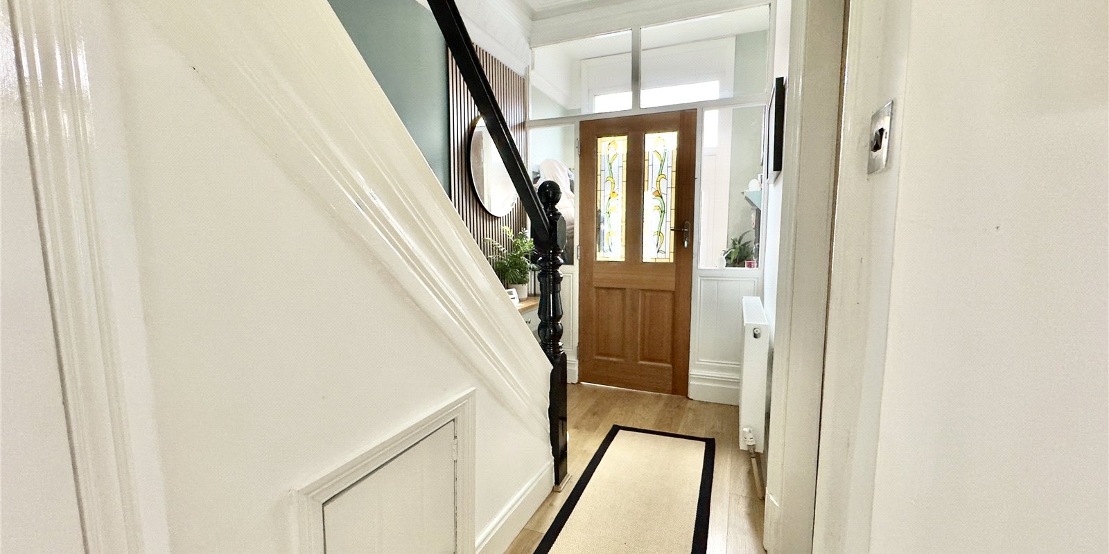 This stunning three-bedroom semi-detached character home perfectly blends timeless charm with a contemporary twist. Entering through the vestibule, you are greeted by geometric tiling and plenty of coat storage, creating a stylish and practical first impression. From the vestibule, a beautiful solid oak front door with stained glass detailing opens into the hallway, which features laminate flooring throughout and feature paneling just before the stairs, providing an ideal spot to hang a mirror and add a touch of personality.