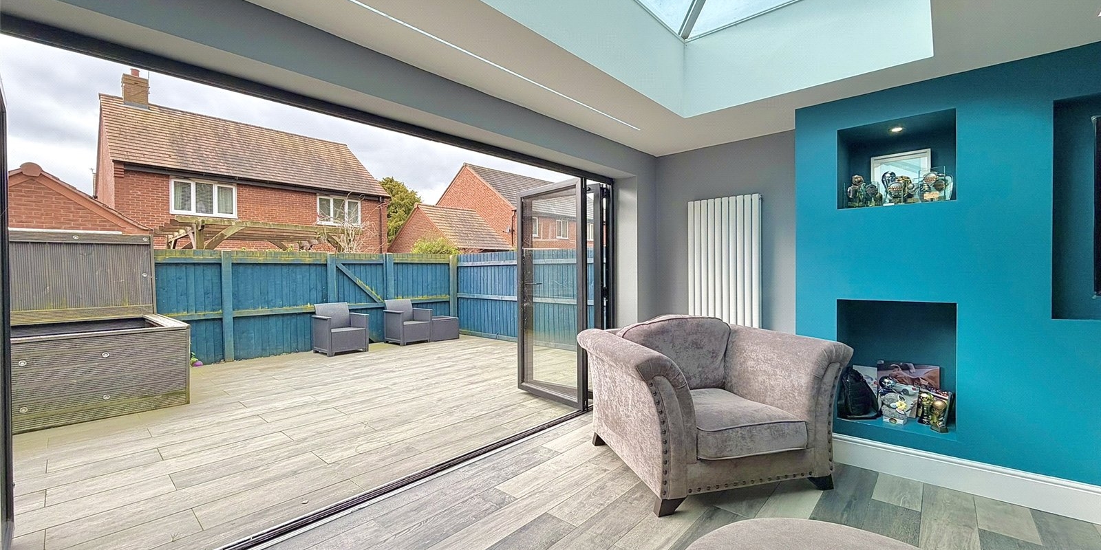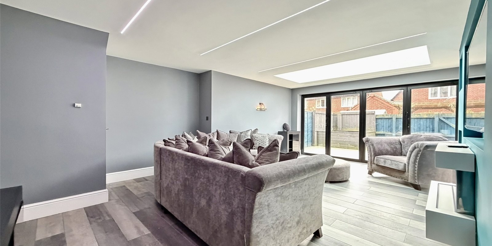 Upon entering the property, you are welcomed by a bright and inviting entrance hall which provides access to the downstairs WC, kitchen and living room. The living space is undoubtedly the standout feature of the home, designed with modern living in mind. Flooded with natural light from the impressive sky lantern and striking bi-fold doors, this superb room also boasts a stylish entertainment wall, creating the ideal environment for relaxing with family or hosting guests.