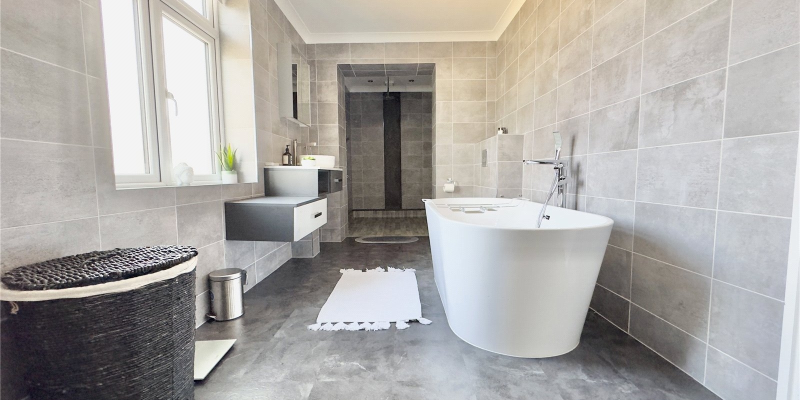 To the first floor, three double-bedrooms, two connected by a "Jack & Jill" en-suite, and a family bathroom which is also connected to the master bedroom. The family bathroom is finished to a beautiful standard, with free-standing bath, and a walk-in waterfall shower.