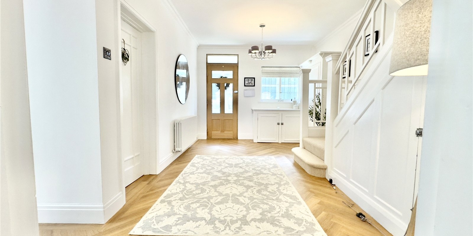 Upon entering, you’re welcomed by a grand entrance hallway with a feature turned staircase, setting the tone for the spacious and high-quality accommodation throughout. The heart of the home is the stunning open-plan L-shaped kitchen/living/dining space — a true showstopper with bi-folding doors, Velux windows, and a bespoke kitchen design featuring a large centre island with induction hob, triple oven and integrated appliances.