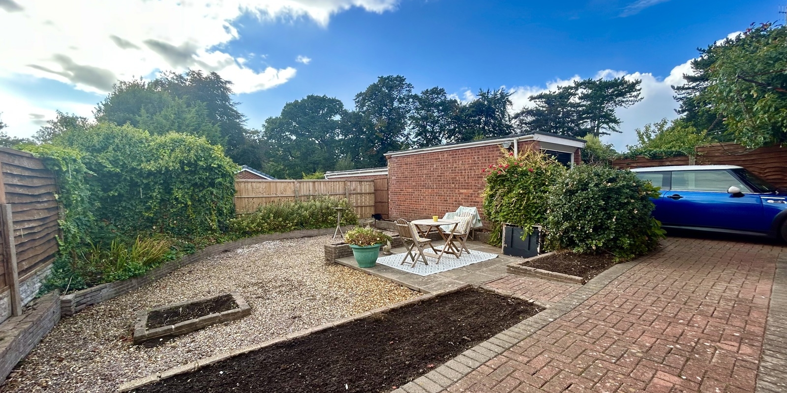 Externally, the property boasts an extended driveway leading to a detached garage, providing ample parking. The low-maintenance garden areas to the front and rear are ideal for those who enjoy outdoor space without the upkeep.