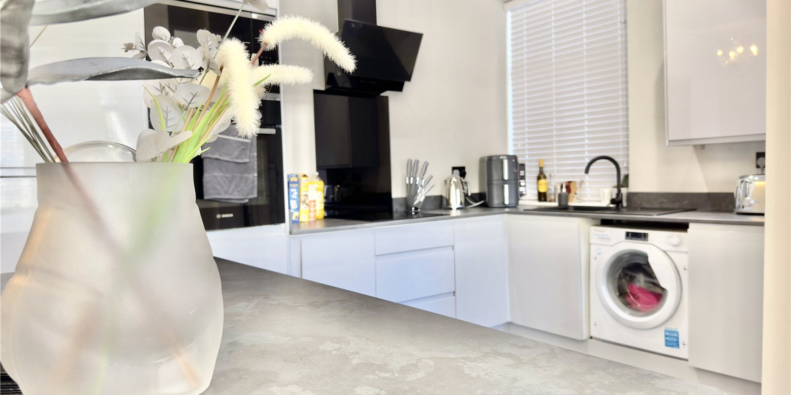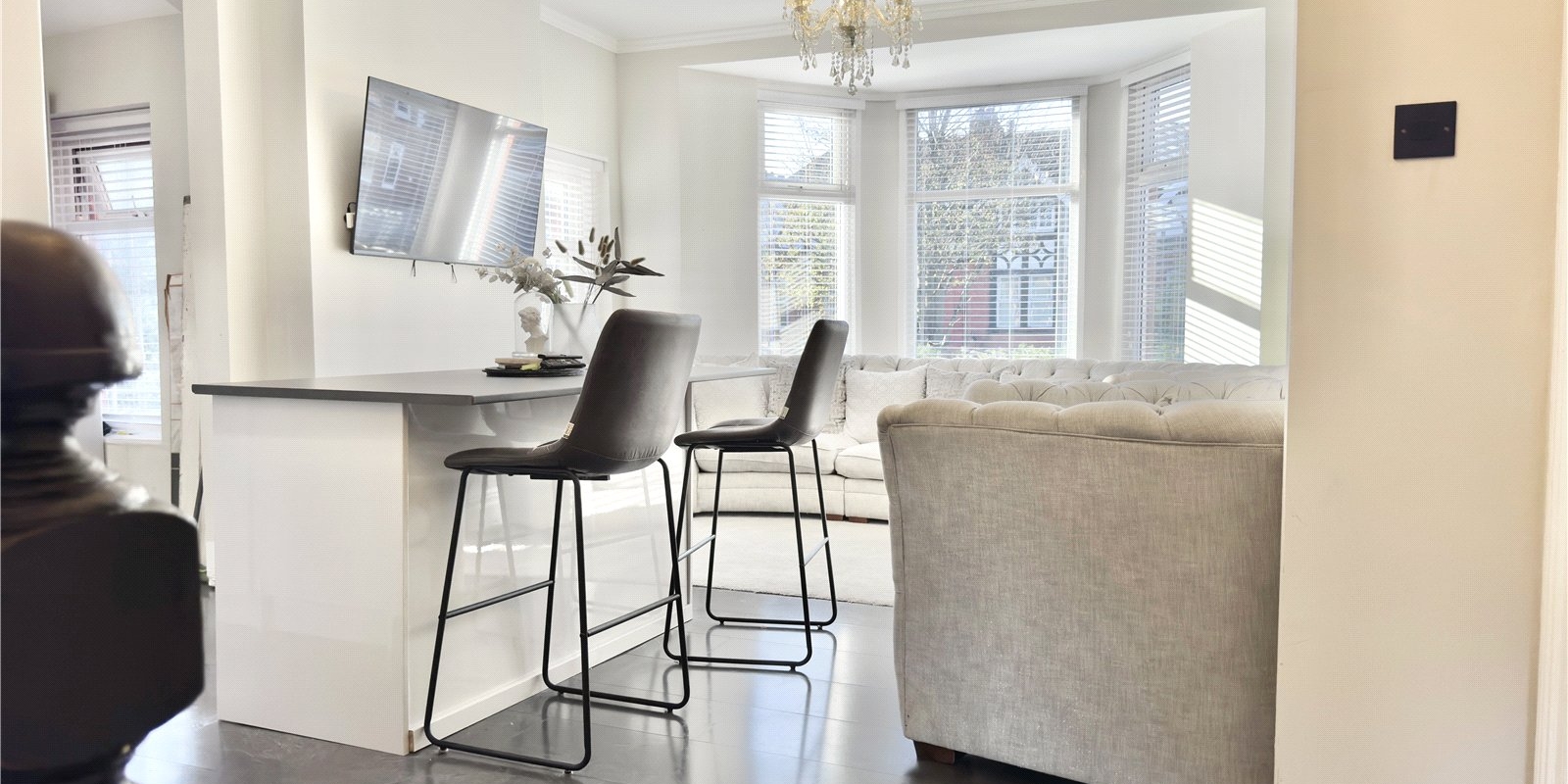 Upstairs, the property opens out into an impressive open-plan kitchen, dining and living area. Bathed in natural light from a striking bay window, this versatile space combines modern design with a sense of calm and openness. The newly installed kitchen features sleek grey cabinetry and a sizeable central island, perfect for relaxed meals or entertaining friends.