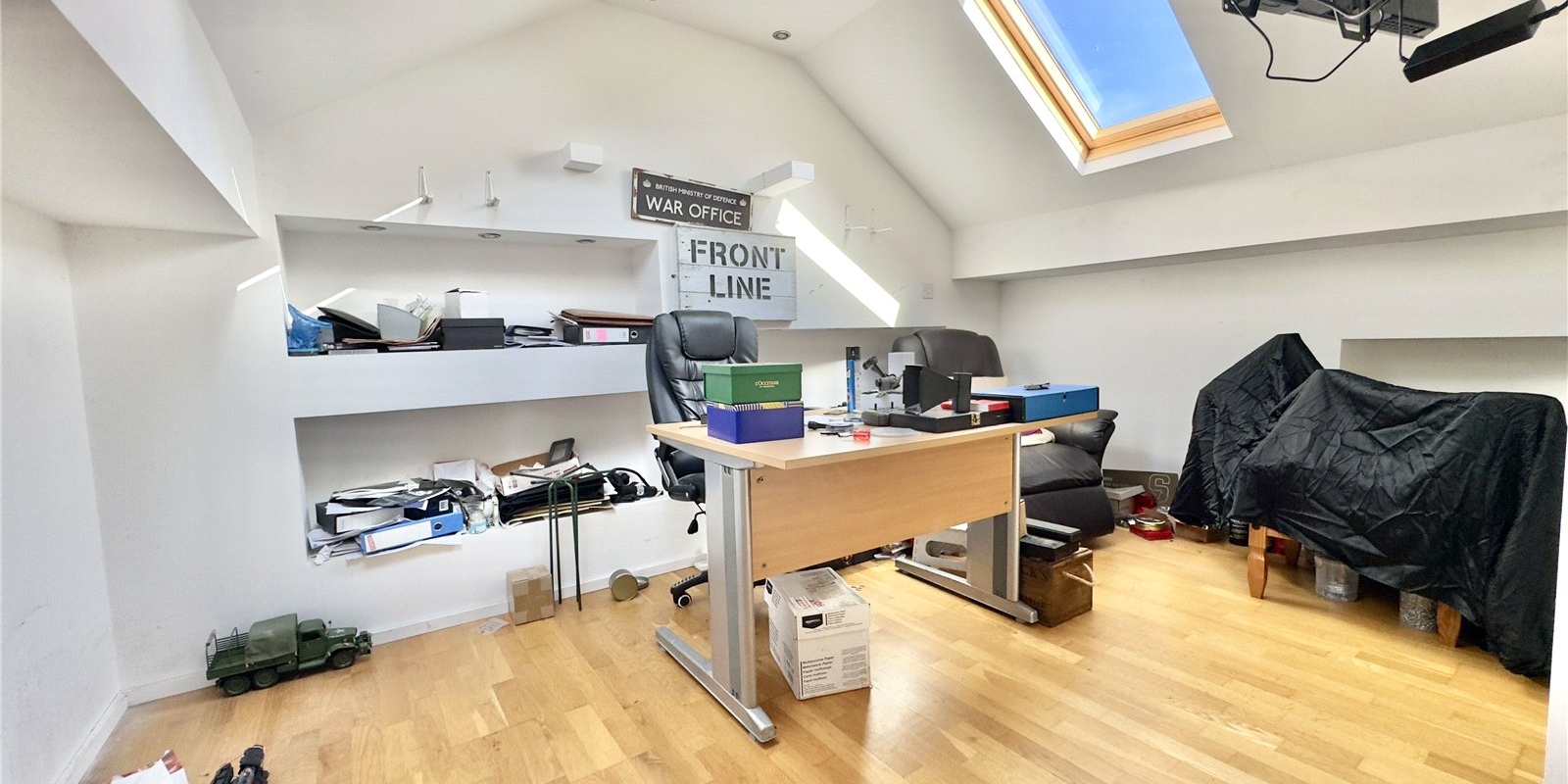 A large conservatory opens onto the wraparound garden – ideal for entertaining or relaxing. Upstairs, you’ll find three well-proportioned double bedrooms with a galley landing and a family bathroom. Bedroom two gives access to the cleverly designed loft room, currently used as a home office, complete with Velux window and WC.